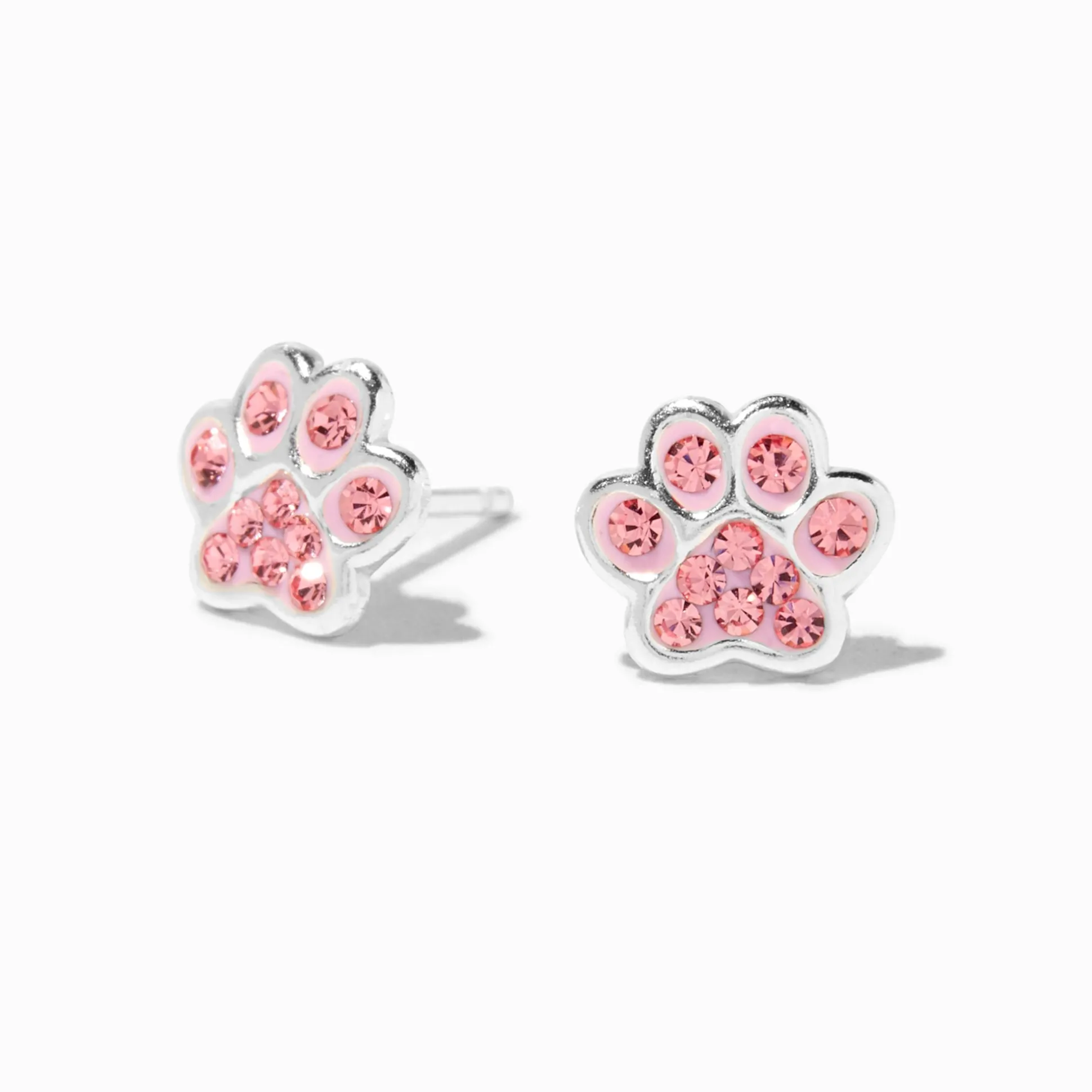 Ces clous d’oreilles stylés nous épatent ! Les designs couleur argentée arborent une forme de patte de chien et des détails de strass roses.
