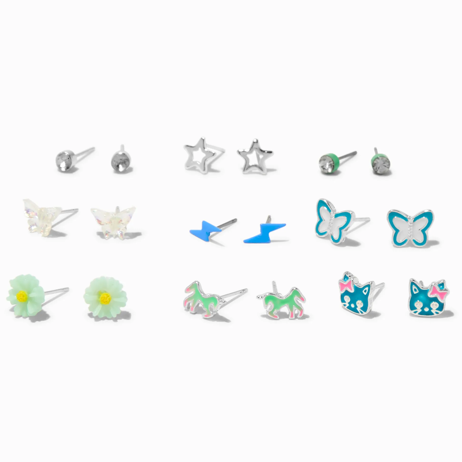 Nous adorons avoir le choix. Pas toi ? Ce lot de 9 paires comprend des tonnes de clous d’oreilles qui compléteront tes tenues préférées. Les designs comprennent notamment des strass, des étoiles, des papillons, des éclairs, des fleurs, des chats et des chevaux.