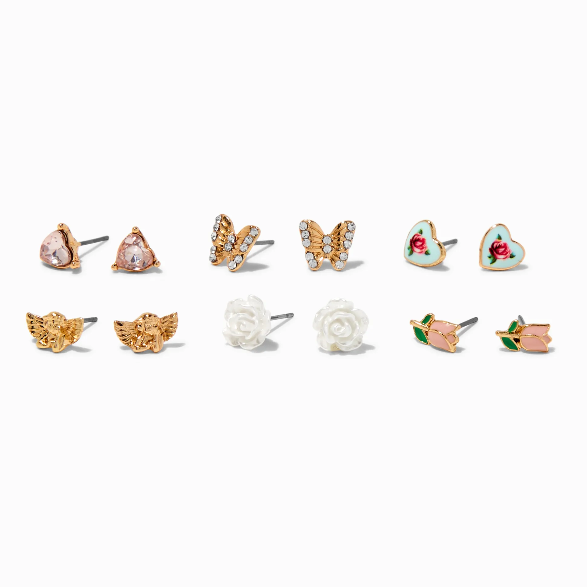 Renouvelle ton look printanier avec la paire de boucles d’oreilles parfaite. Ce lot de six paires comprend des tulipes, des roses, des cœurs, des papillons et des anges.