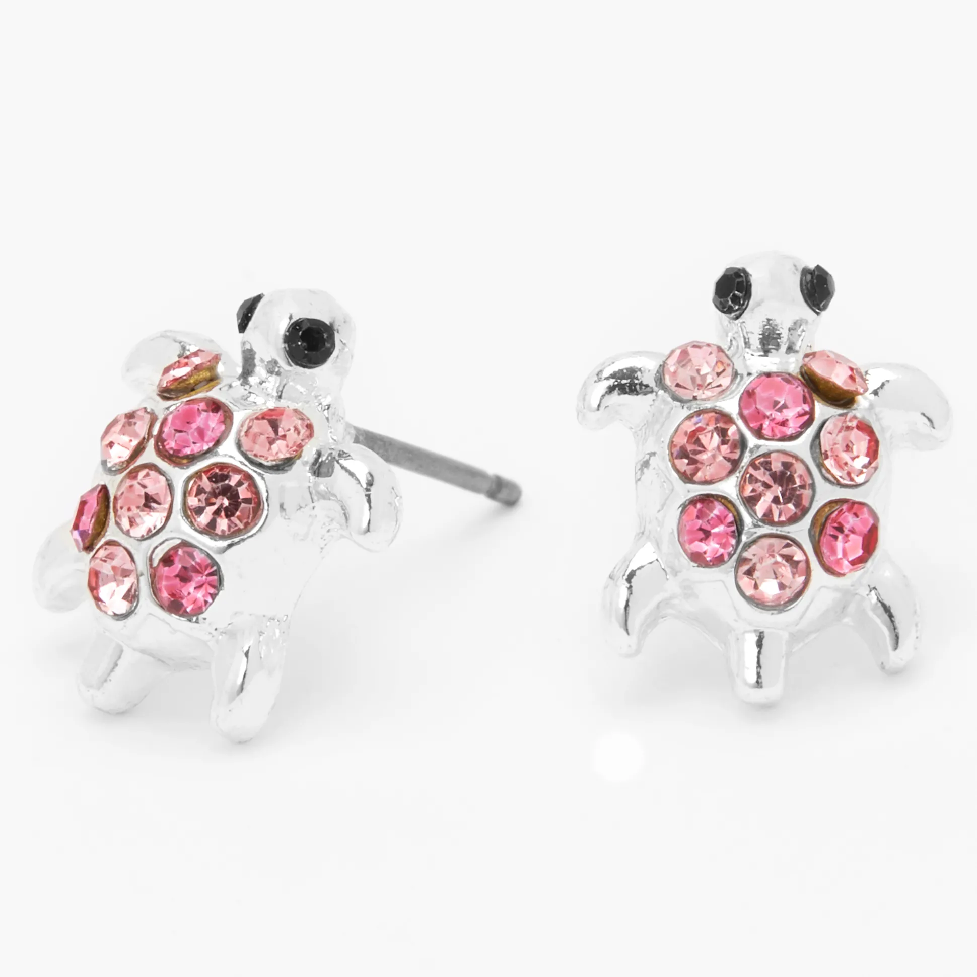 Donne un peu de « turtle power » à tes oreilles avec ces jolis clous d’oreilles roses. Des tortues couleur argentée délicates sont ornées de magnifiques strass roses.