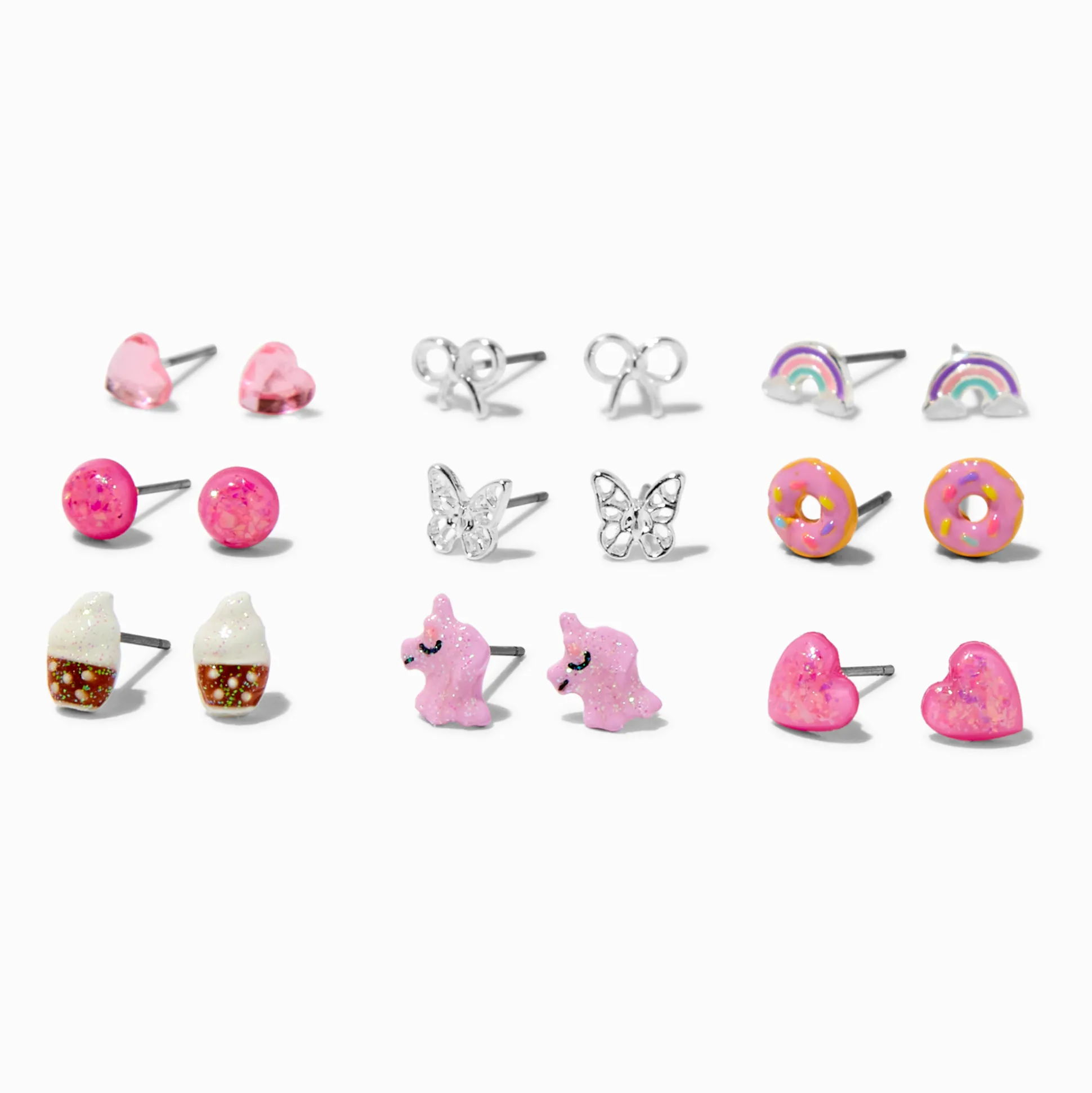 Ajoute un look unique sur tes oreilles avec ce lot aux designs nombreux et variés de clous adorables. L’ensemble de 9 paires comprend des licornes roses, des cœurs roses, des nœuds couleur argentée, des arcs-en-ciel, des boules roses, des papillons en filigrane, des donuts roses, des lattes et des cœurs en strass roses.