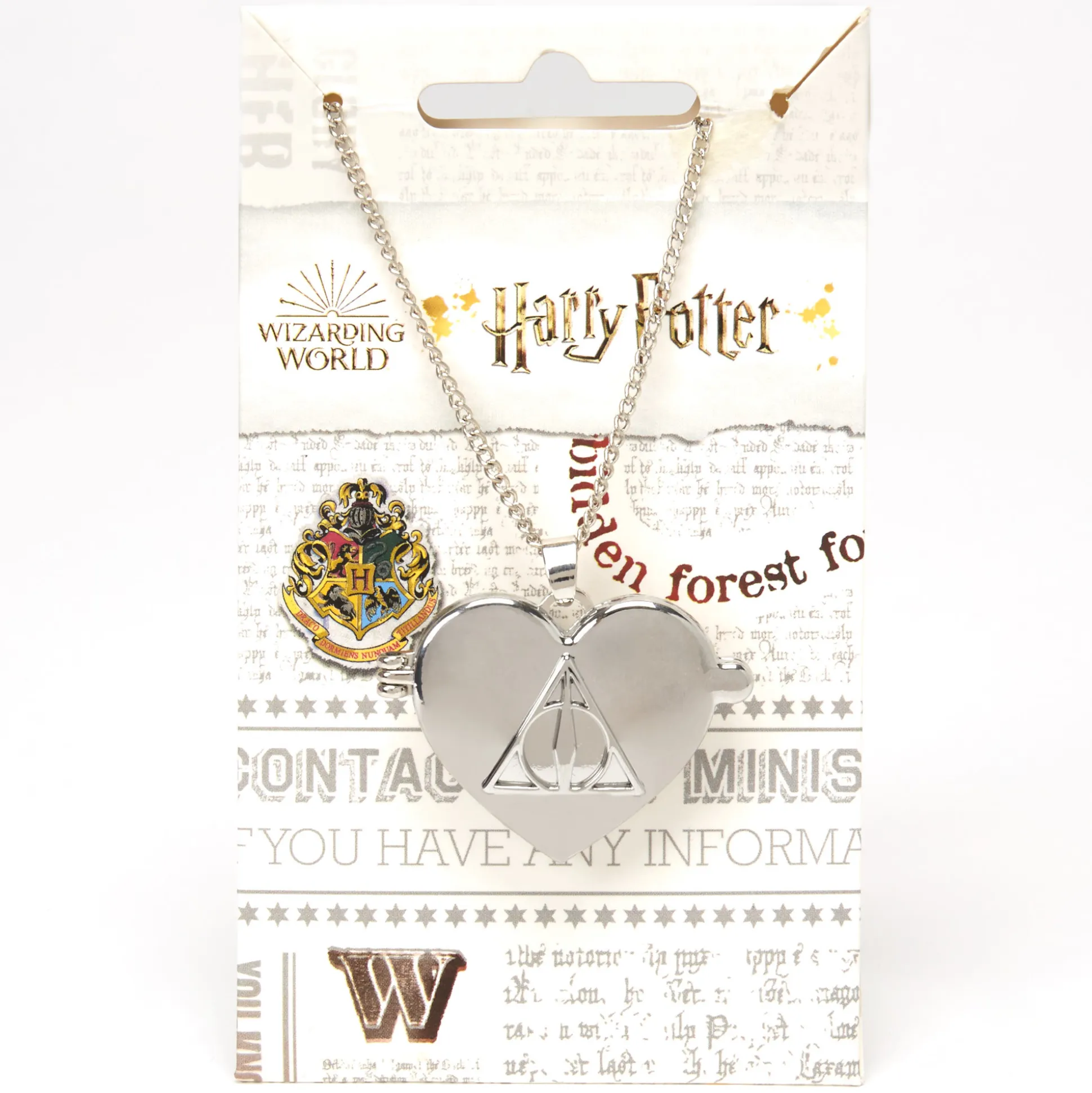 Deviens le maître de la mort avec ce médaillon Reliques de la Mort de Harry Potter™ ! Ce magnifique médaillon en forme de cœur couleur argentée représente la fameuse cape d’invisibilité, la baguette de sureau et le symbole de la pierre de résurrection sur le devant. Ouvre-le pour révéler une image magique de Poudlard à la nuit tombée.