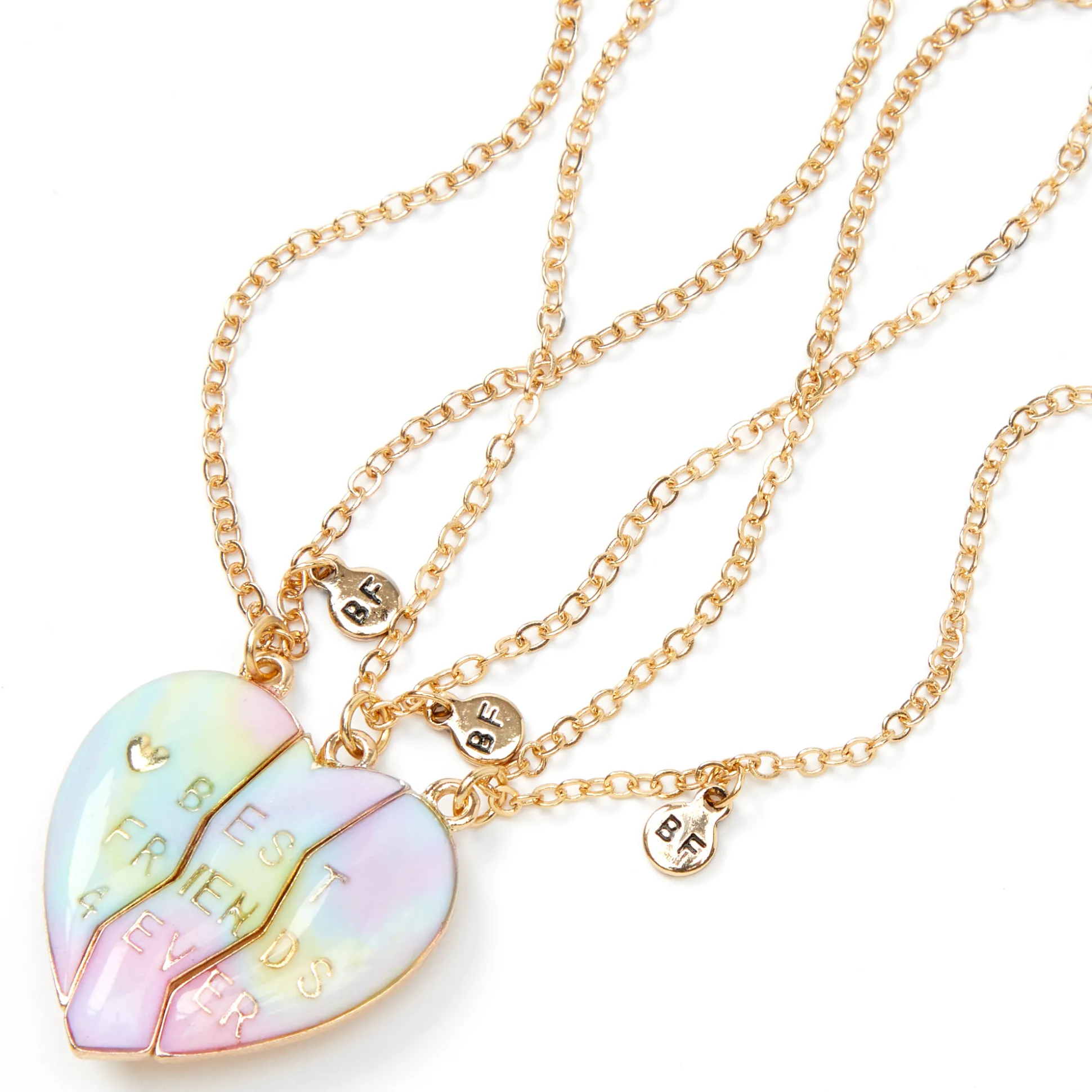 Ce lot de colliers à pendentif est idéal pour assortir ton collier avec celui de tes besties ! Ce lot de 3 pendentifs en cœurs séparables comporte des couleurs roses et bleues pastel avec un dégradé de couleurs.