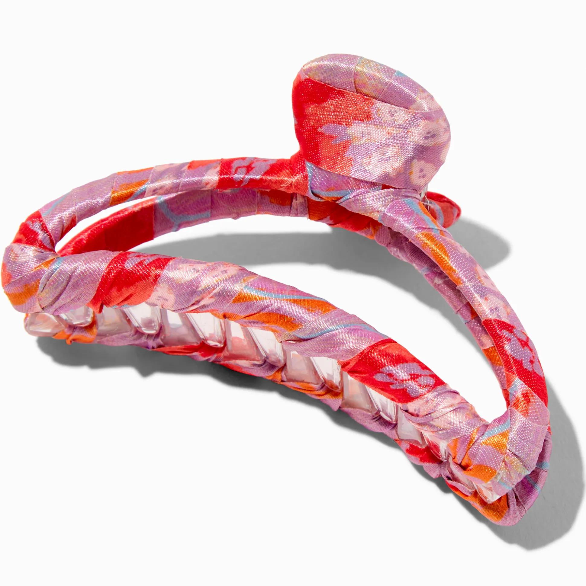 Pull your hair up or back in flawless fun style with this hair claw! Featuring a fabric design that’s covered in a coral tone, this hair claw is a must-have accessory for your warm weather look.