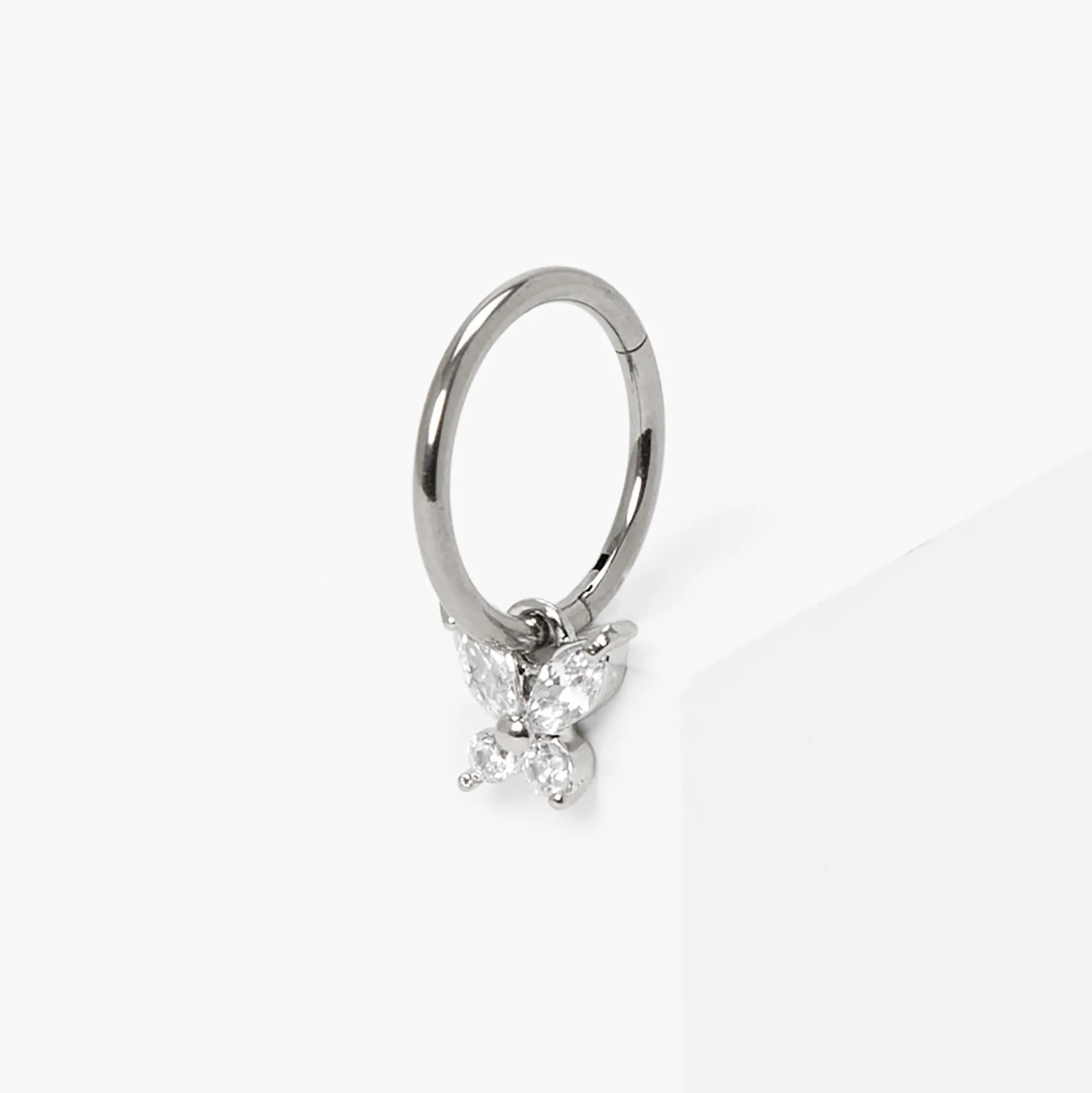 Dis bonjour à la boucle d’oreille de cartilage parfaite pour les fans de papillons ! Cette boucle d’oreille de cartilage couleur titanée est agrémentée d’une breloque papillon en strass suspendu au centre de l’anneau.