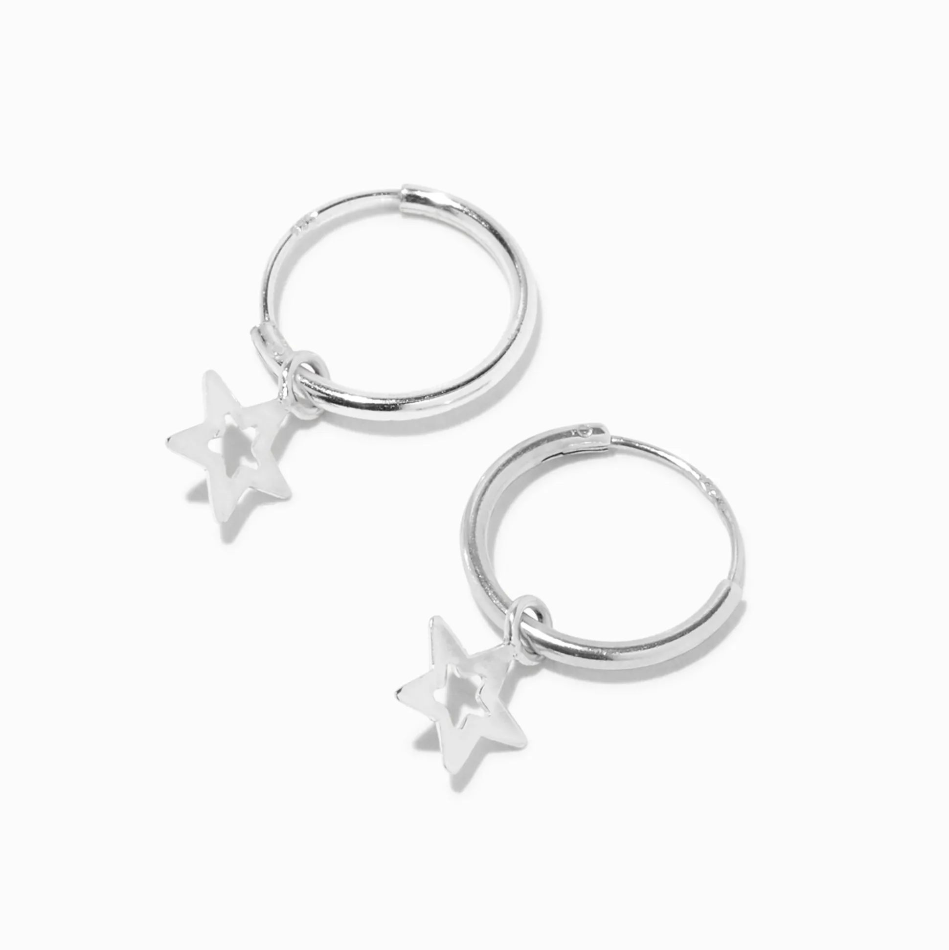 Ajoute une petite touche éblouissante à tes oreilles avec ces créoles ! Cette paire de boucles d’oreilles couleur argentée comprend une mini breloque étoile pendant de chaque créole.