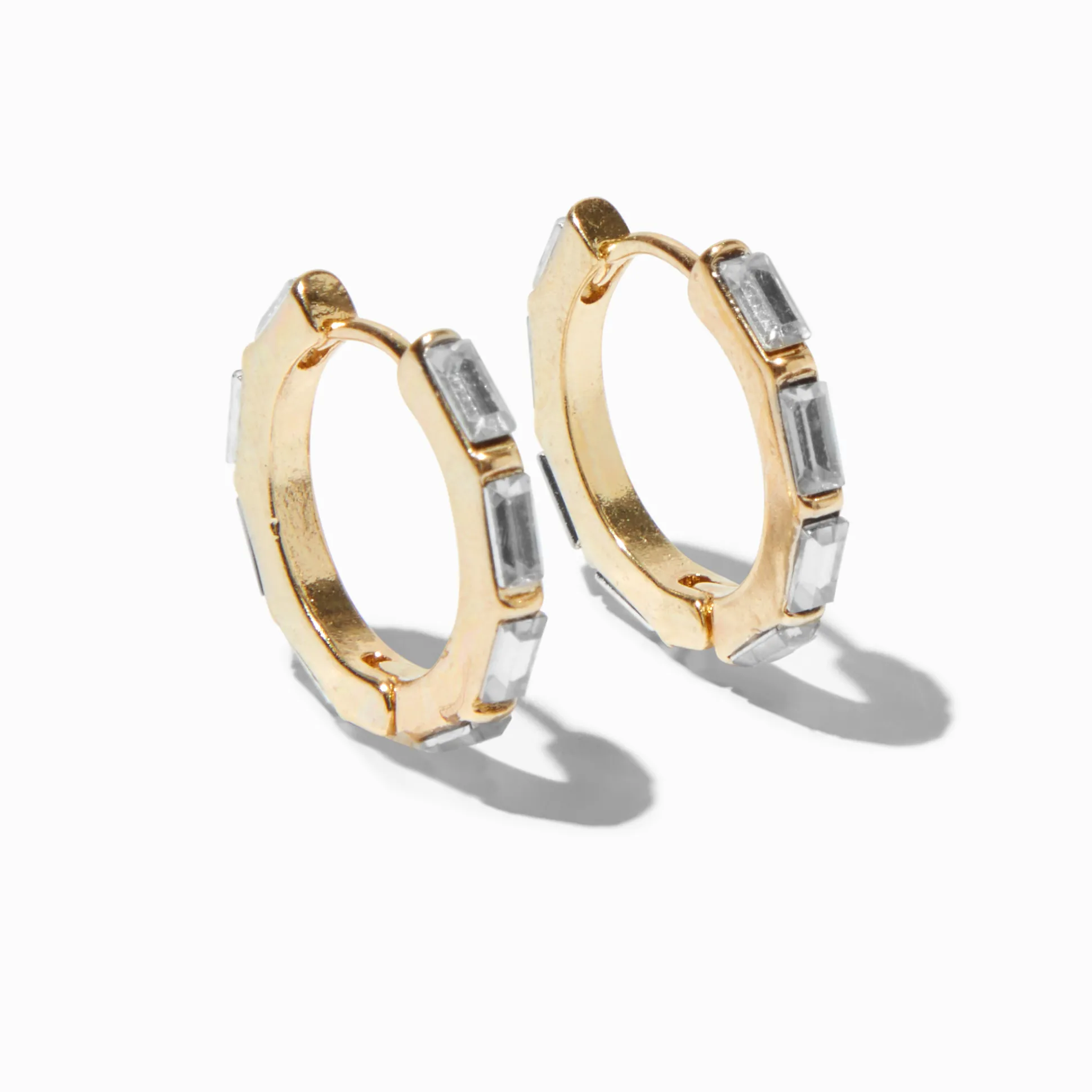 Complète ton superbe look couleur dorée avec ces créoles. Les créoles à charnière sont couvertes de strass en forme de baguette.