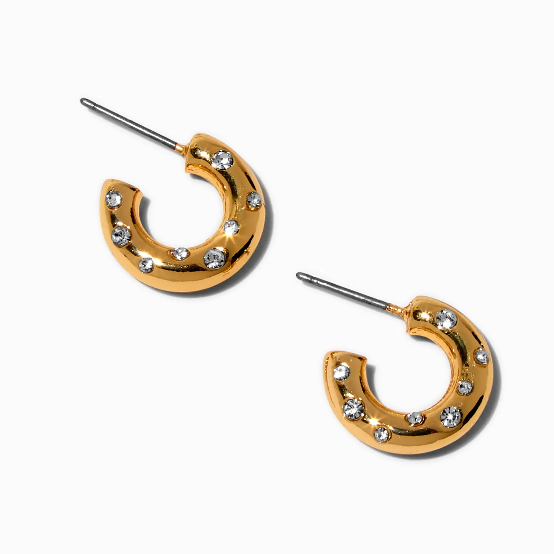 Remplace tes créoles banales par ces petites beautés cloutées flashy. Les créoles couleur dorée sont parsemées de strass.