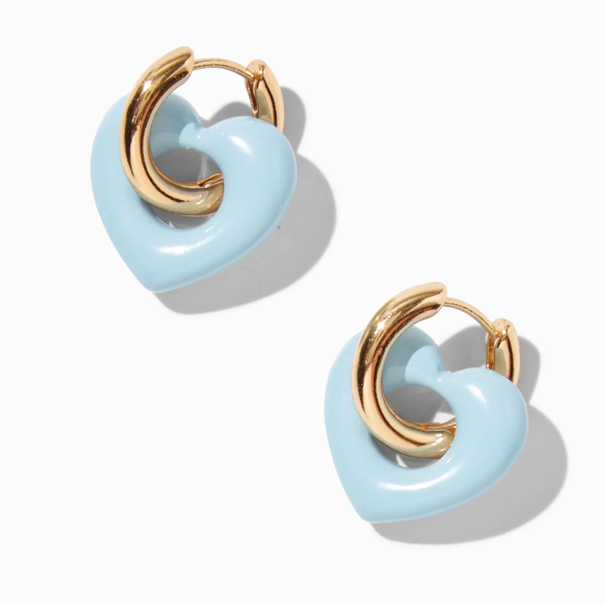 Sois toi et sois au top avec ces créoles couleur dorée. Chaque créole à charnière est décorée d’un cœur bombé de couleur bleu clair.