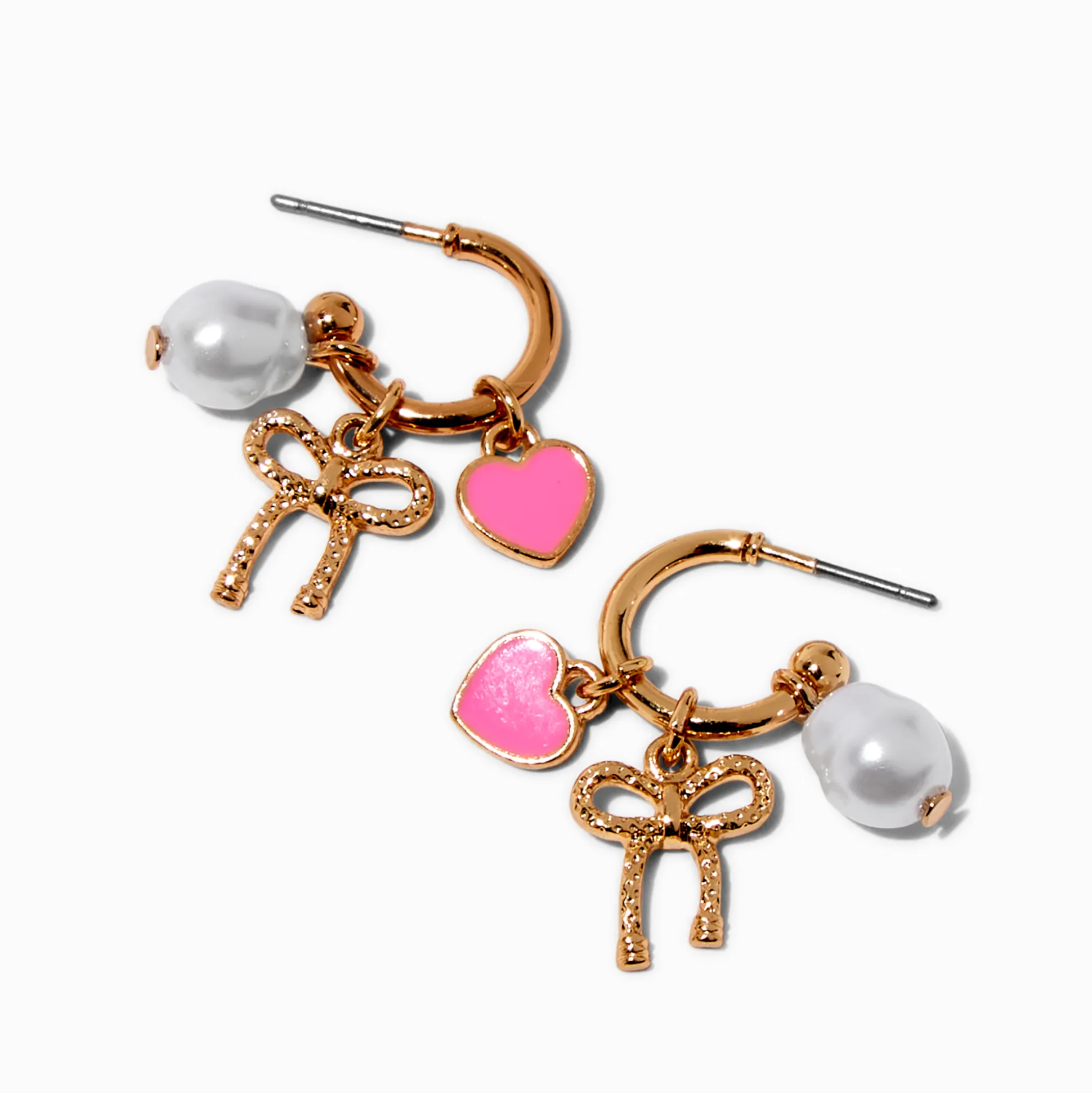 Ajoute une touche de charme à ton look de tous les jours avec ces créoles. Les boucles d’oreilles couleur dorée arborent des tiges arrière faciles à utiliser, et d’adorables breloques pendantes.