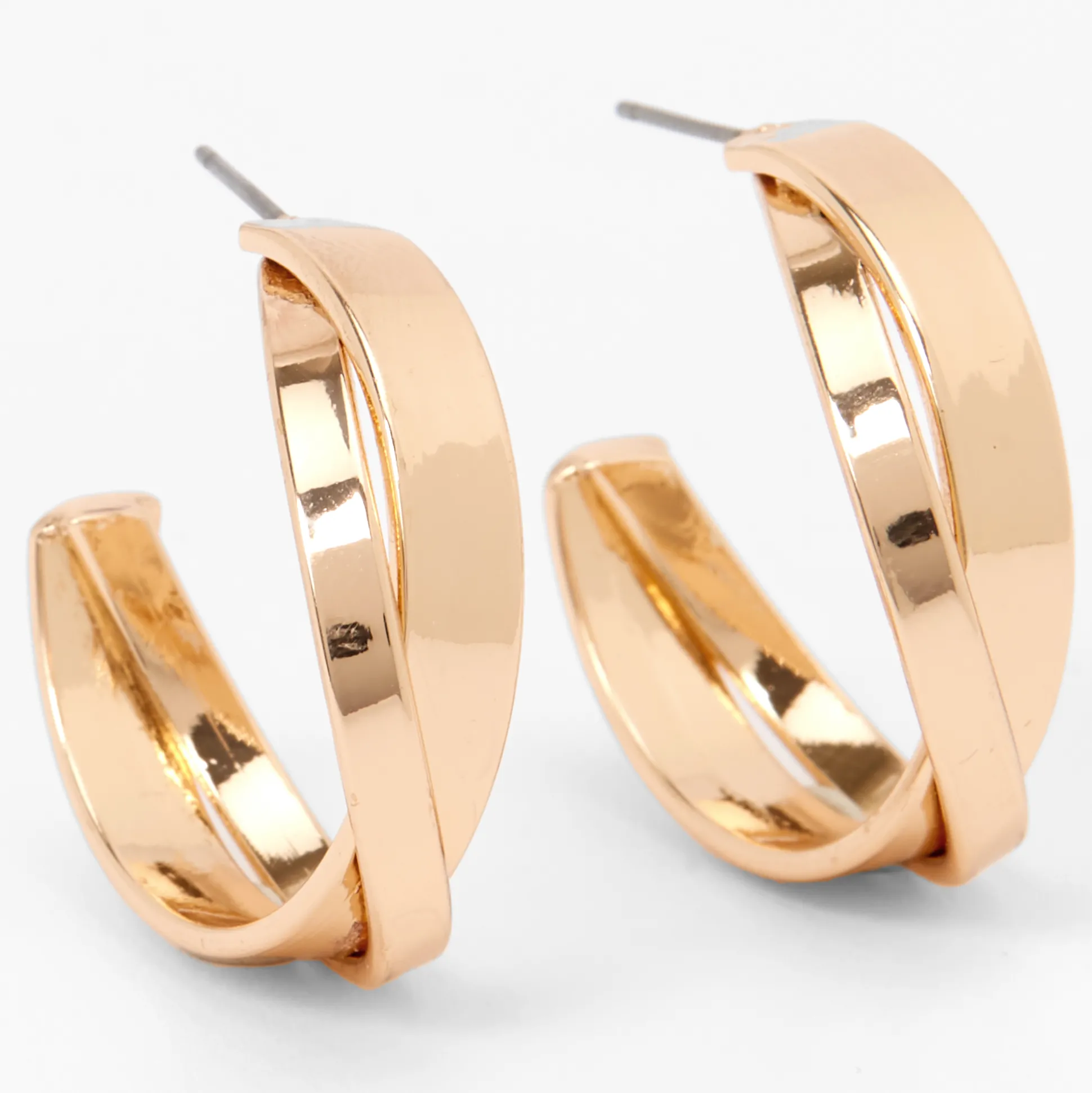 Deux créoles couleur dorée, une épaisse et une fine, s’entrecroisent pour former ces boucles d’oreilles élégantes. Elles sont suffisamment uniques pour faire de toi une fashionista, mais aussi suffisamment simples pour être assorties à tes autres bijoux couleur dorée.