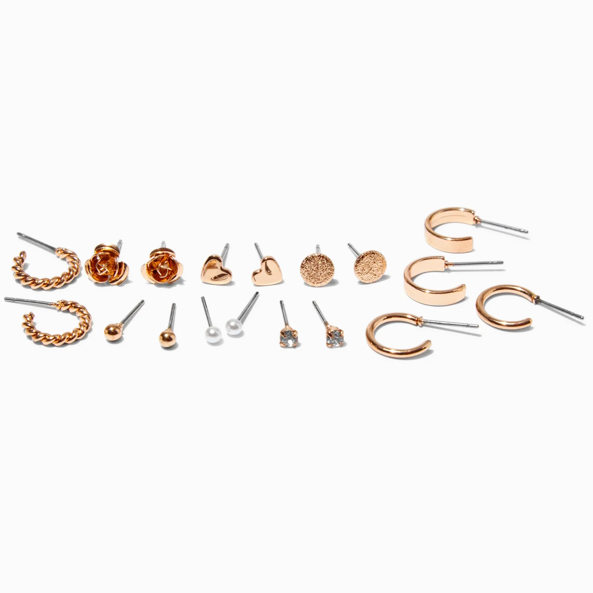 Mets en valeur tes multiples piercings à l’oreille avec ce lot couleur dorée. Le lot de neuf paires comprend trois paires de créoles de styles assortis plus six paires de clous avec des designs rose, cœur, perle d’imitation, disque texturé, strass, et boule classique. Compose ton propre style selon ton humeur en faisant du mix and match.