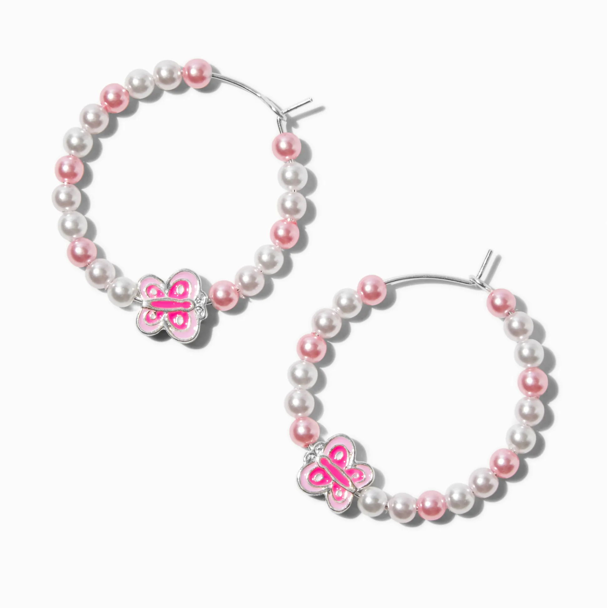 Ajoute une touche papillon à ta tenue avec ces créoles. Les créoles couleur argentée sont agrémentées de billes roses et blanches et d’une breloque papillon rose.