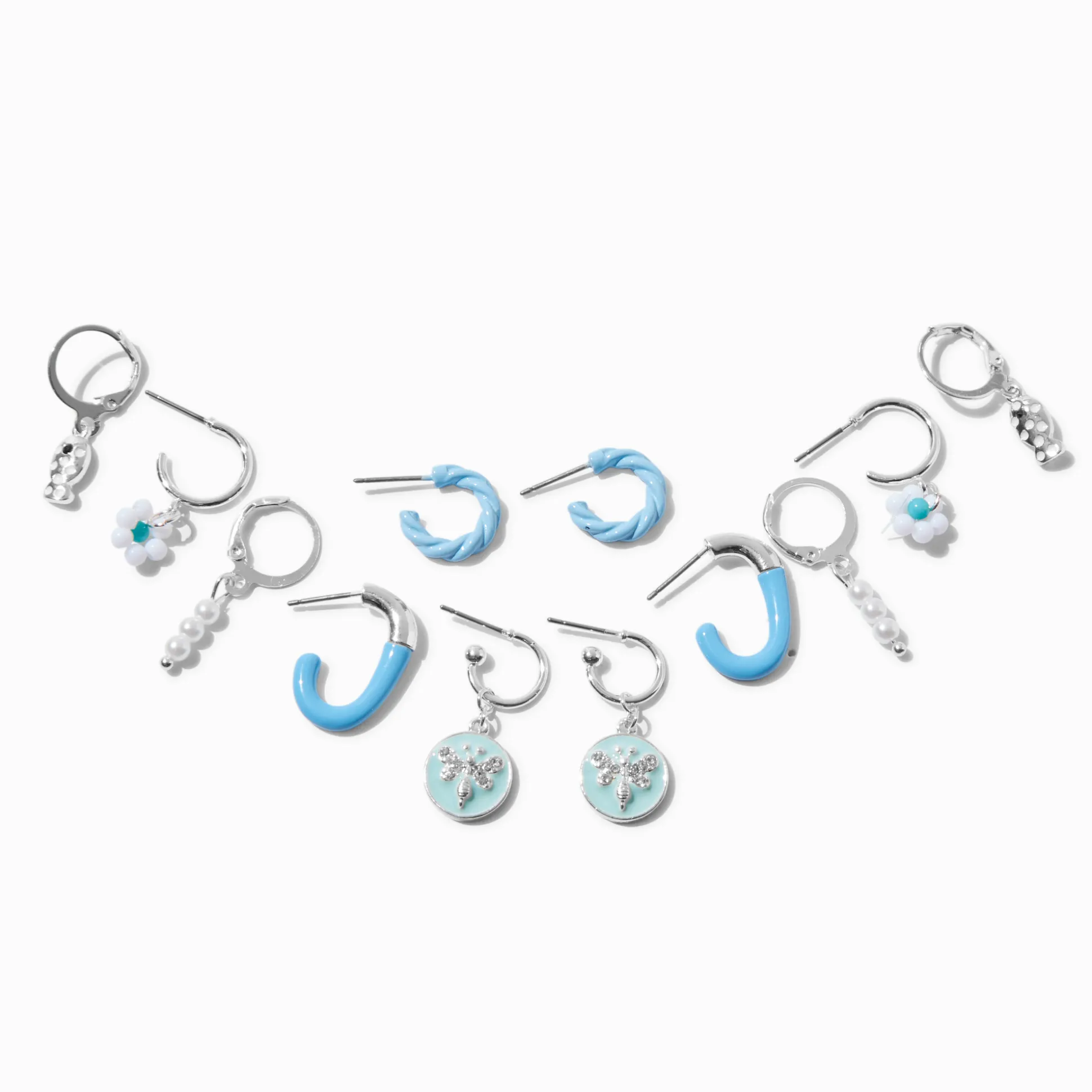 Rehausse ta tenue printanière avec cette collection de créoles super tendance, conçue pour mettre en avant tes multiples piercings. À porter ensemble ou une paire à la fois. Les six paires comprennent des créoles bleu clair torsadées, des créoles émaillées bleu clair, des créoles à breloque à fleur perlées blanches, des créoles à breloque zig zag, des créoles avec des perles d’imitation, et des créoles pièces et papillons.