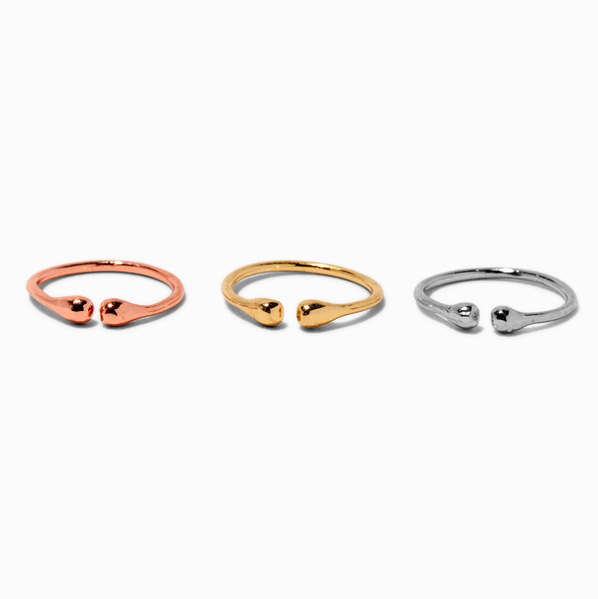 Pas de piercing, pas de problème ! Ce lot contient 3 faux anneaux de nez en métaux mixtes en couleur argentée, couleur dorée et couleur dorée rose, et chaque anneau possède une bille en son centre.