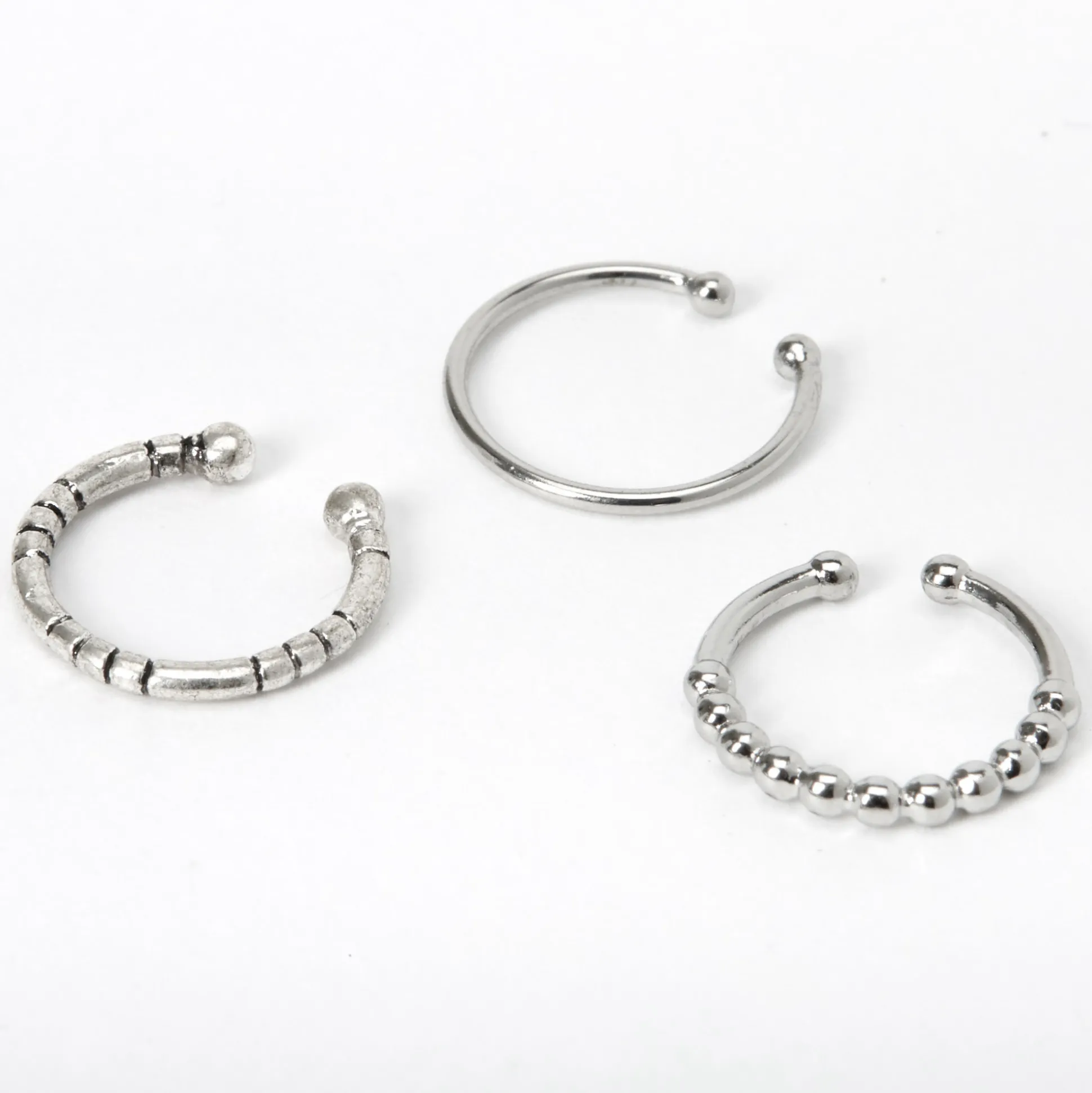 Obtiens le look d’un vrai anneau de nez sans te faire percer le nez ! Ce lot comprend 3 faux anneaux de nez couleur argentée avec des textures différentes.