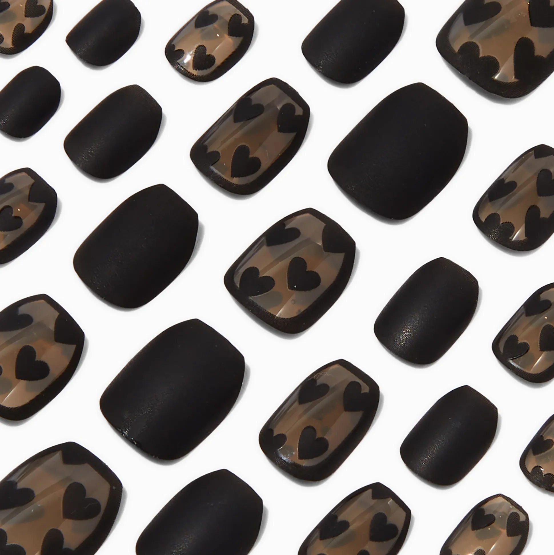 Décore tes doigts avec le style sombre de ce lot de faux ongles tendance. Ce lot de faux ongles de forme ballerine arbore un design cœur extra-fins noirs. Ces faux ongles vegan s’appliquent facilement : appuie dessus et tu es prête !