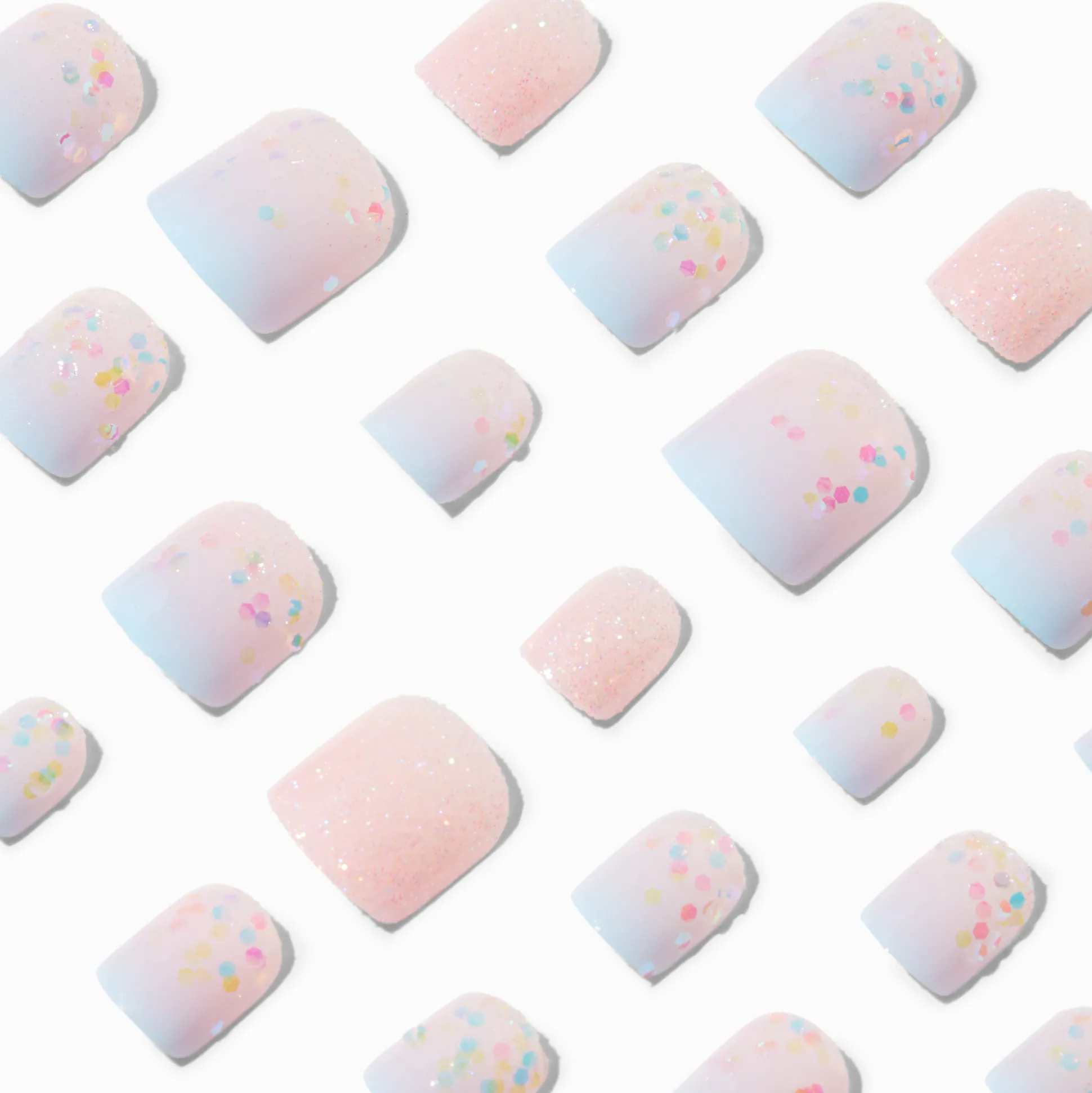 Imprègne-toi de bonnes ondes estivales jusqu’au bout de tes doigts avec ce lot de faux ongles super tendance. Ce lot de faux ongles de forme carrée arbore une collection de designs dégradés et pailletés Ces faux ongles sont vegan et s’appliquent très rapidement : appuie dessus et tu es prête !