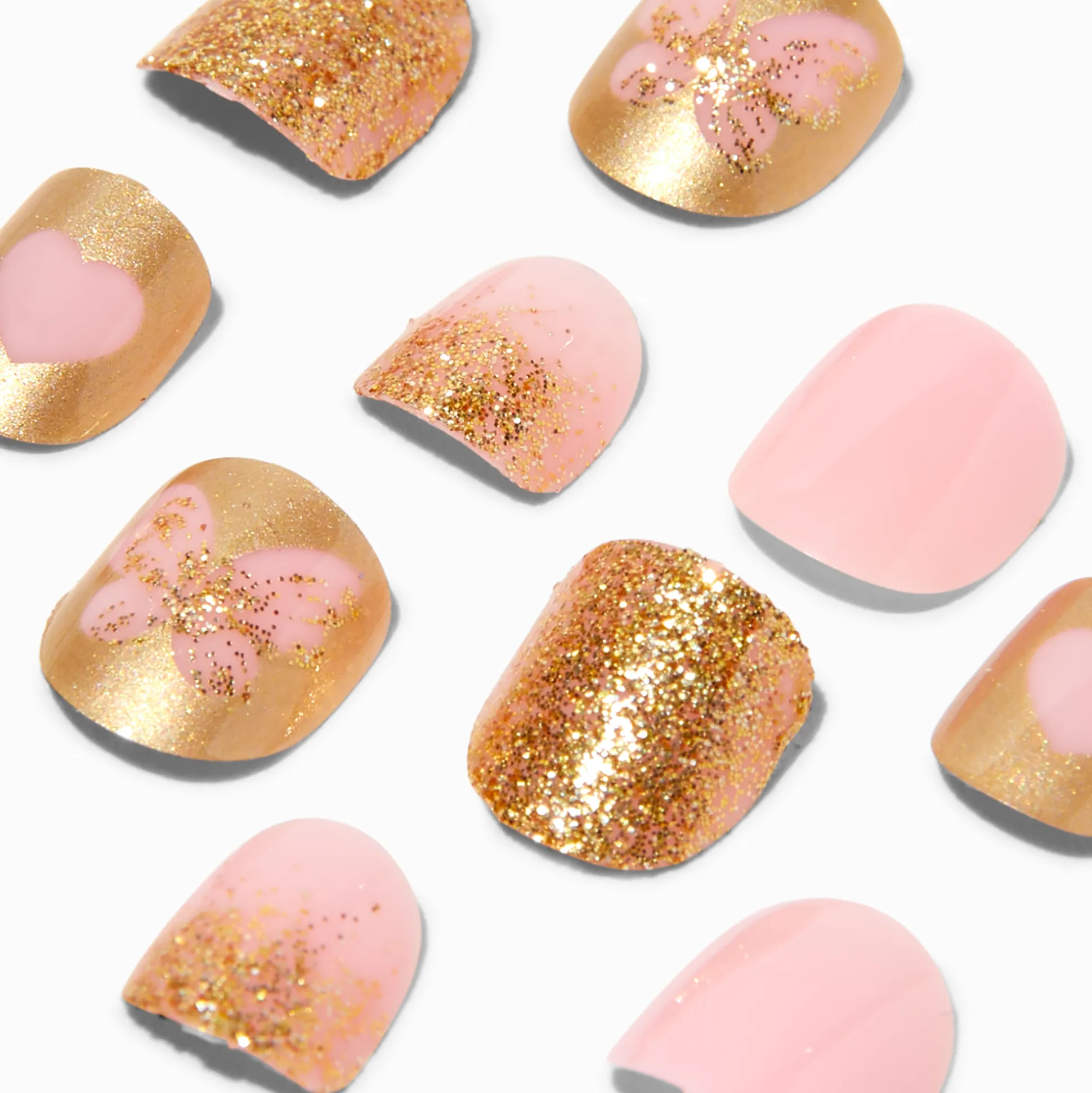 Si tu cherches un look tendance, essaie ce lot de faux ongles vegan à paillettes. Parfait pour tous les types de doigts, ce lot est orné de papillons prenant leur envol avec un détail paillettes couleur dorée. Pour passer une super soirée, applique simplement ces faux ongles pré-collés à la base de la cuticule et appuie dessus fermement pour obtenir une manucure rapide et digne d’un institut de beauté !