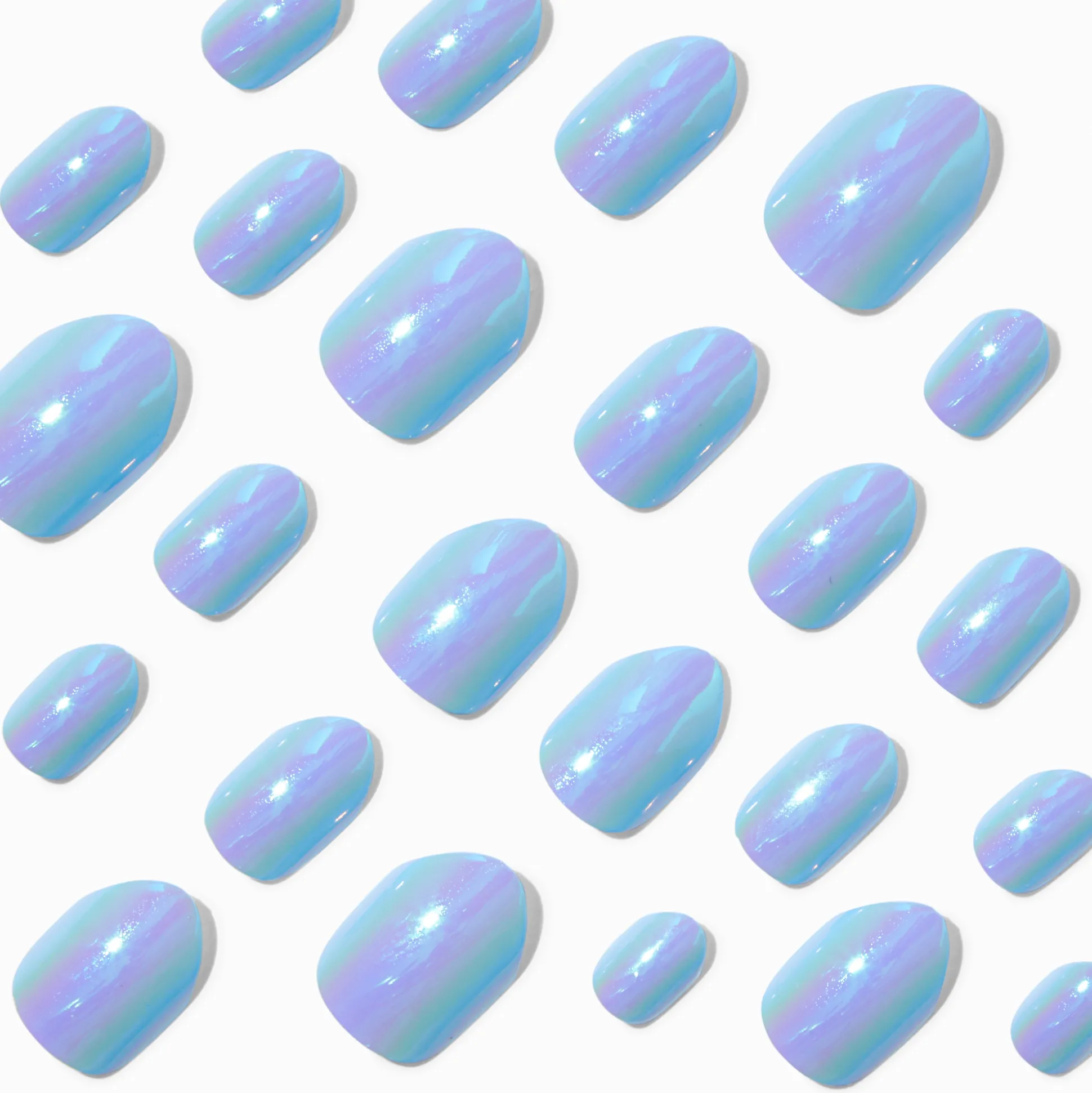 Adopte la tendance chromée avec cet ensemble de faux ongles à la mode. Ces ongles en forme de stiletto arborent une finition chromée bleue. Ces ongles s’appliquent facilement : appuie dessus et tu es prête !