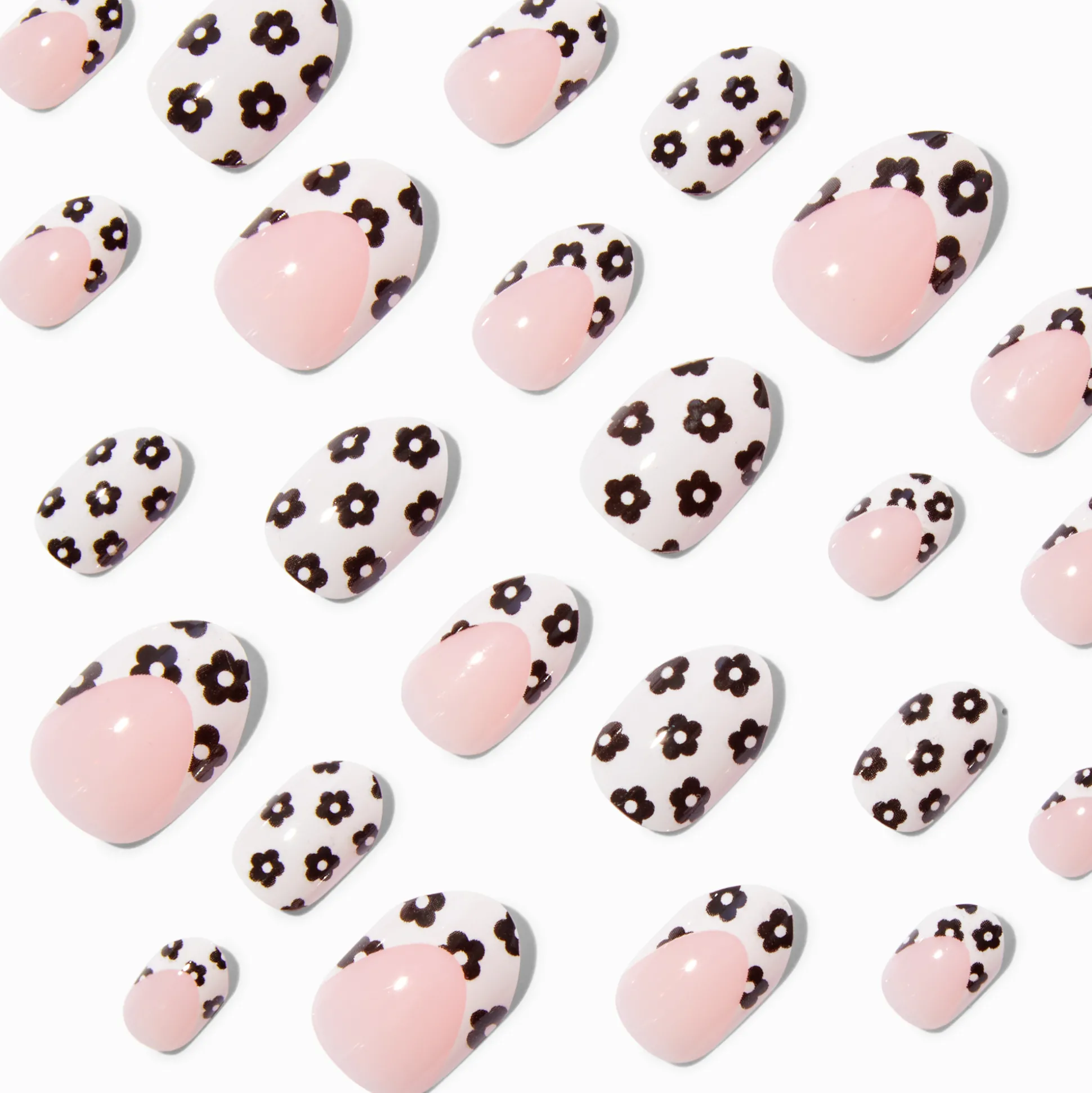 Décore tes doigts avec les jolies marguerites de ce lot de faux ongles tendance. Le lot de faux ongles de forme stiletto arbore des motifs marguerite stylisés en noir et en blanc. Ces ongles s’appliquent facilement : appuie dessus et tu es prête !