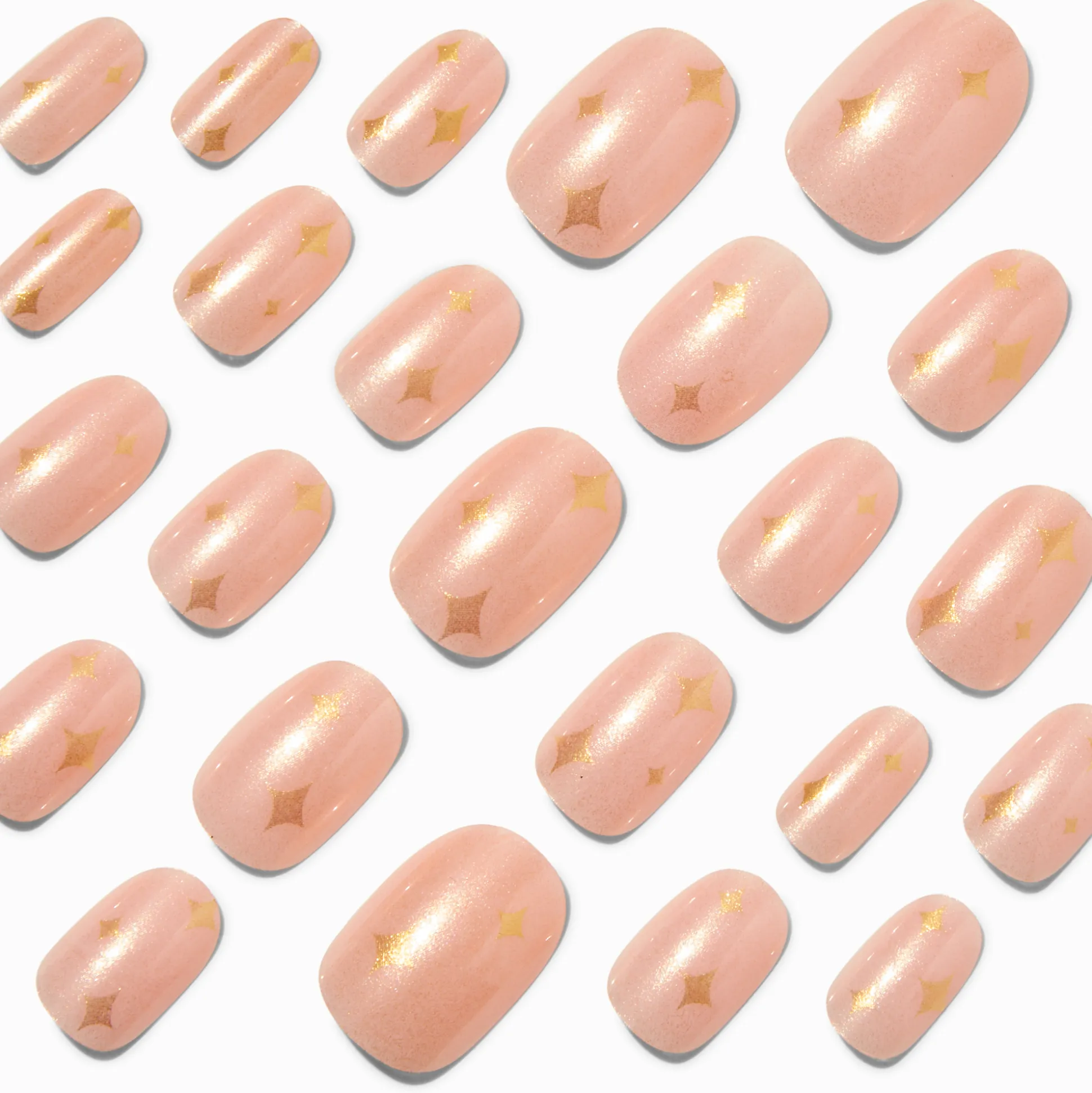 Avec une coupe améliorée et une tenue allant jusqu’à 7 jours, ces faux ongles vegan sont des incontournables à la pointe de la mode. Avec 12 tailles différentes, trouver la forme parfaite n’a jamais été aussi simple. De forme ovale et de taille moyenne, ces faux ongles arborent un fini à paillettes couleur dorée ornés de détails célestes.