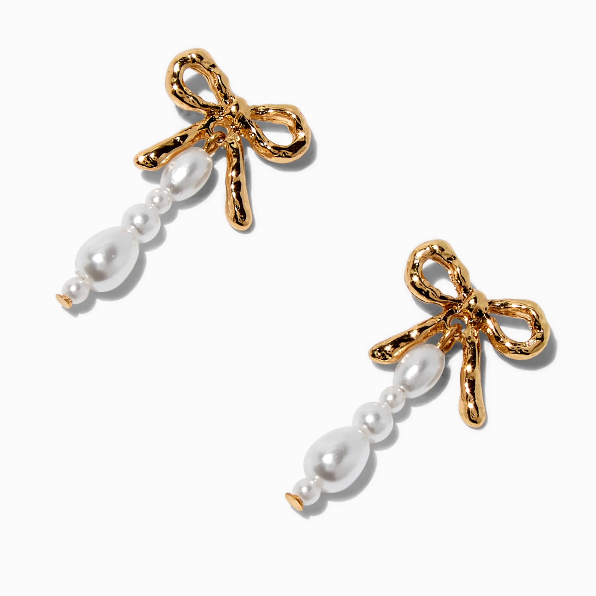 Finish your OOTD with a bow on these drop earrings. The gold-tone designs have a dazzling bow shape that has a dangling row of faux pearls to slay in coquette.