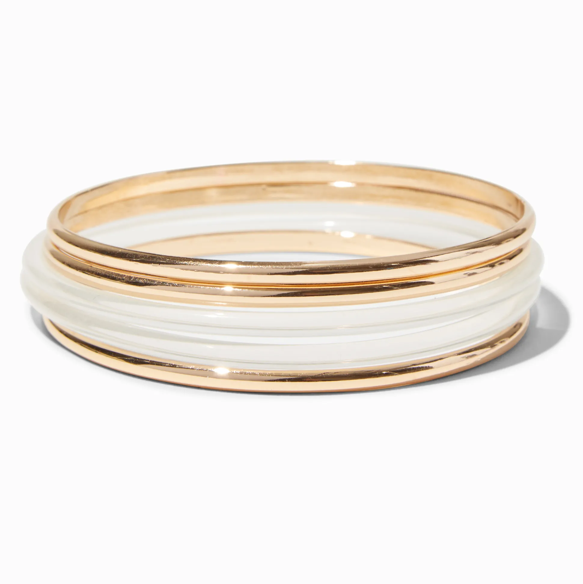 Add some subtle style to your wrist with these gold-tone and clear resin bangles. These bangles come in an 5-pack, so you can mix and match based on your look.