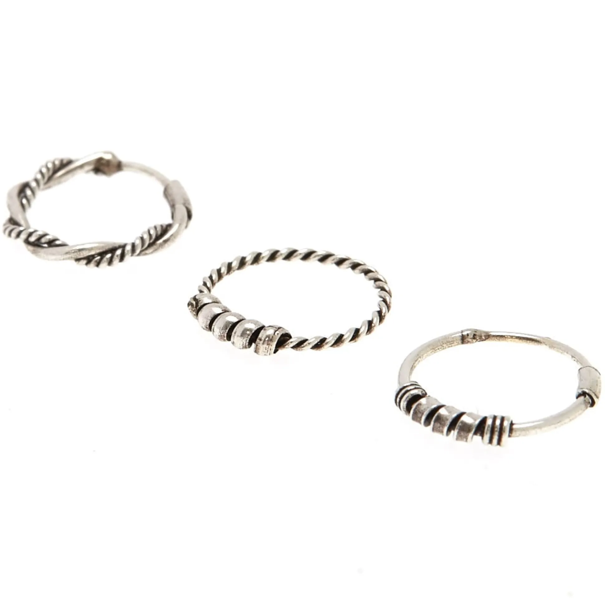 Reste simple avec ces créations couleur argentés & texturées funky ! Arbore ces anneaux pour le nez tressés Bali couleur argenté tous les jours ou pour une occasion spéciale ! Trois par lot.