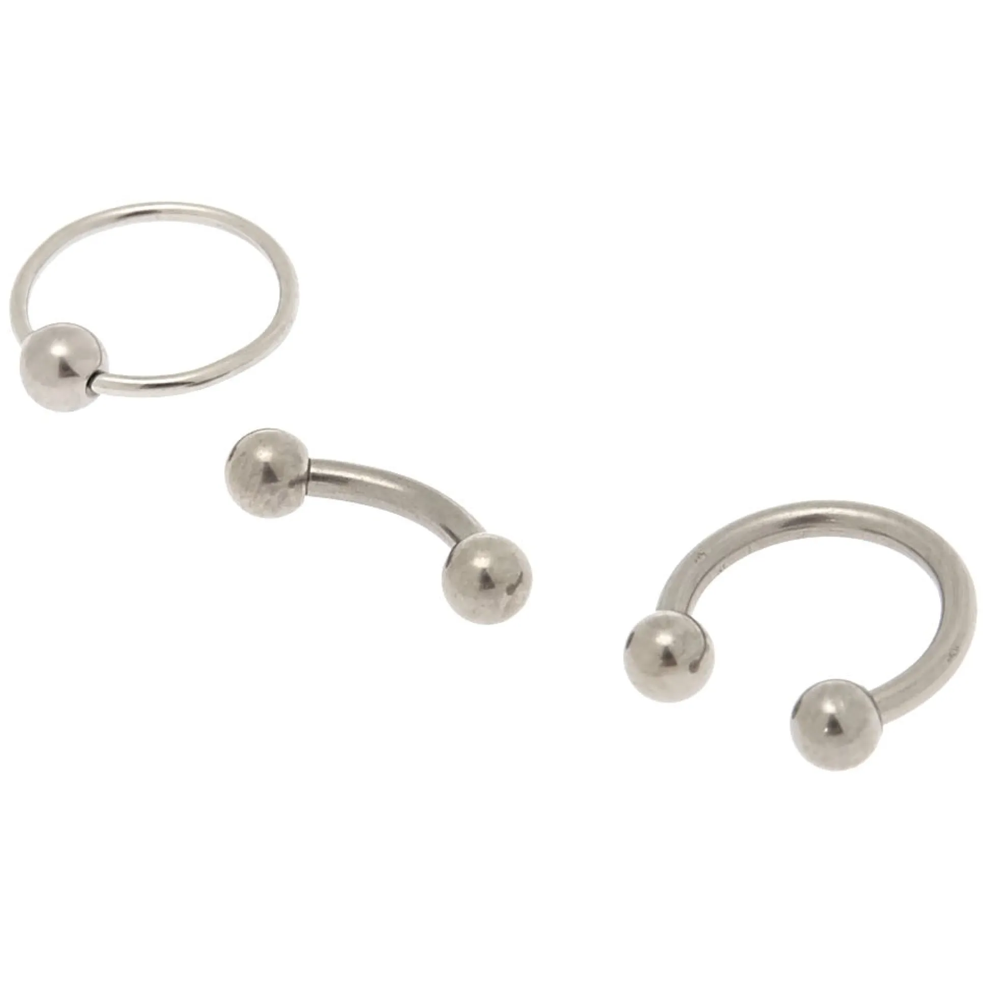 Change de forme de piercing d’oreille selon ton humeur avec cet assortiment. Chaque boucle d’oreille couleur argenté comporte une tige couleur titané et une fermeture en perle d’imitation.