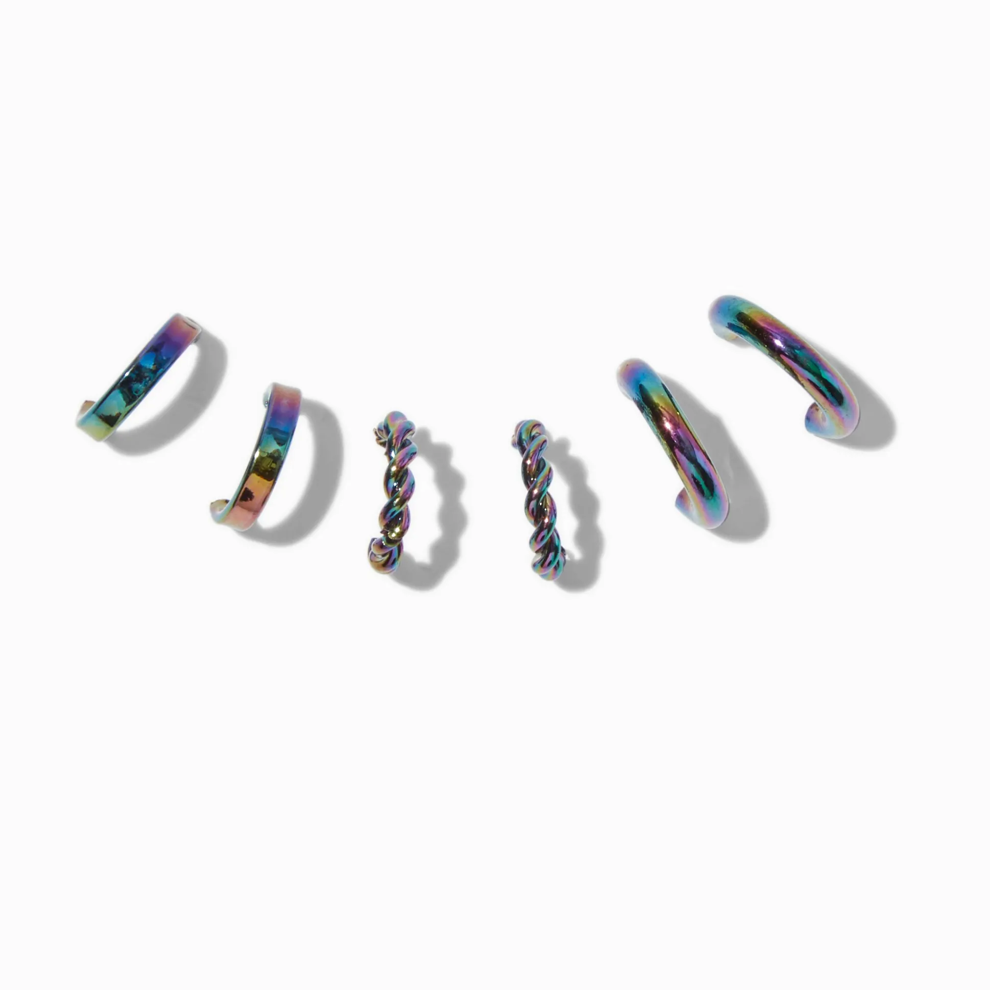 Superpose ces créoles coordonnées et crée ton propre univers. Ce lot est parfait pour arborer fièrement ton piercing double ou plus. Le lot comprend des créoles sans décoration, torsadée et texturée, d’une couleur arc-en-ciel anodisée et voyante.