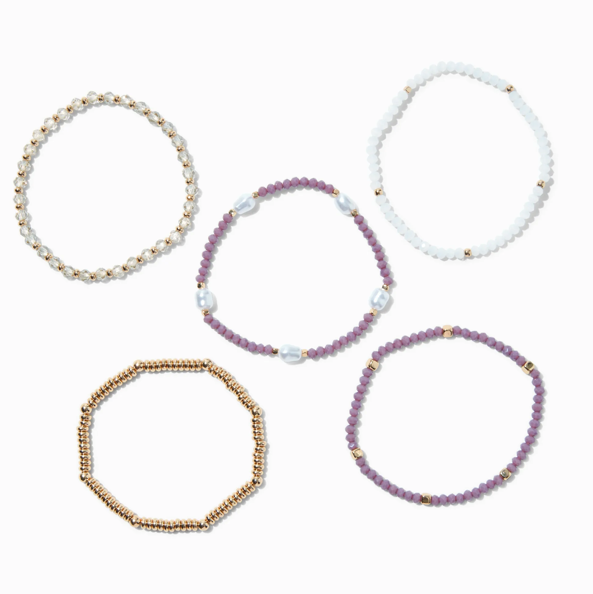 Add more layers to your arm party with these stretch bracelets. The gold-tone bracelets have faux pearls, mauve beads, and more.