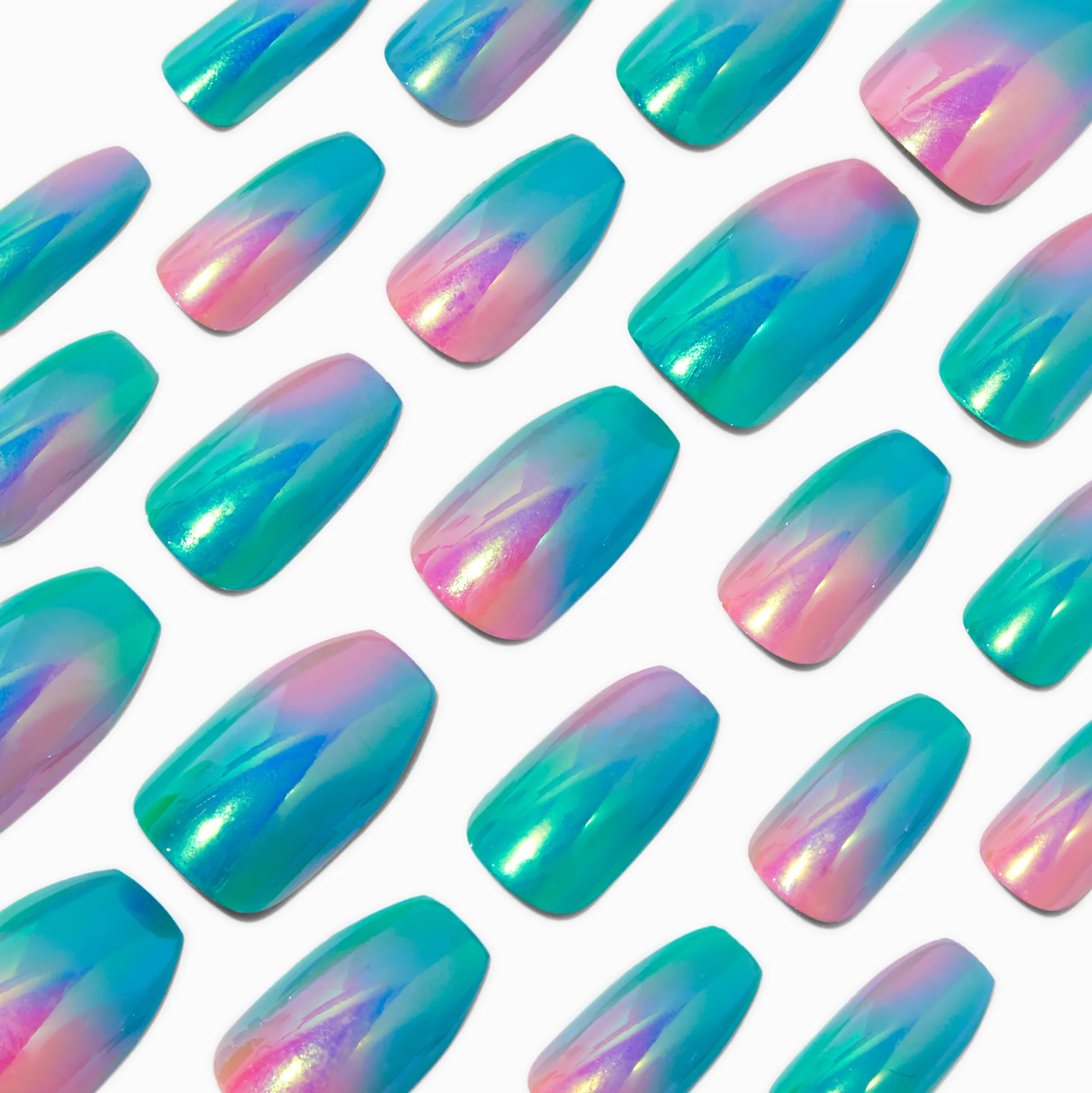 With an improved fit and up to a 7-day wear, these coffin vegan faux nails are on-trend faves. They come in 12 different sizes, so finding the perfect shaped nail is a breeze. With a coffin shape, these faux nails have a rainbow chrome finish.