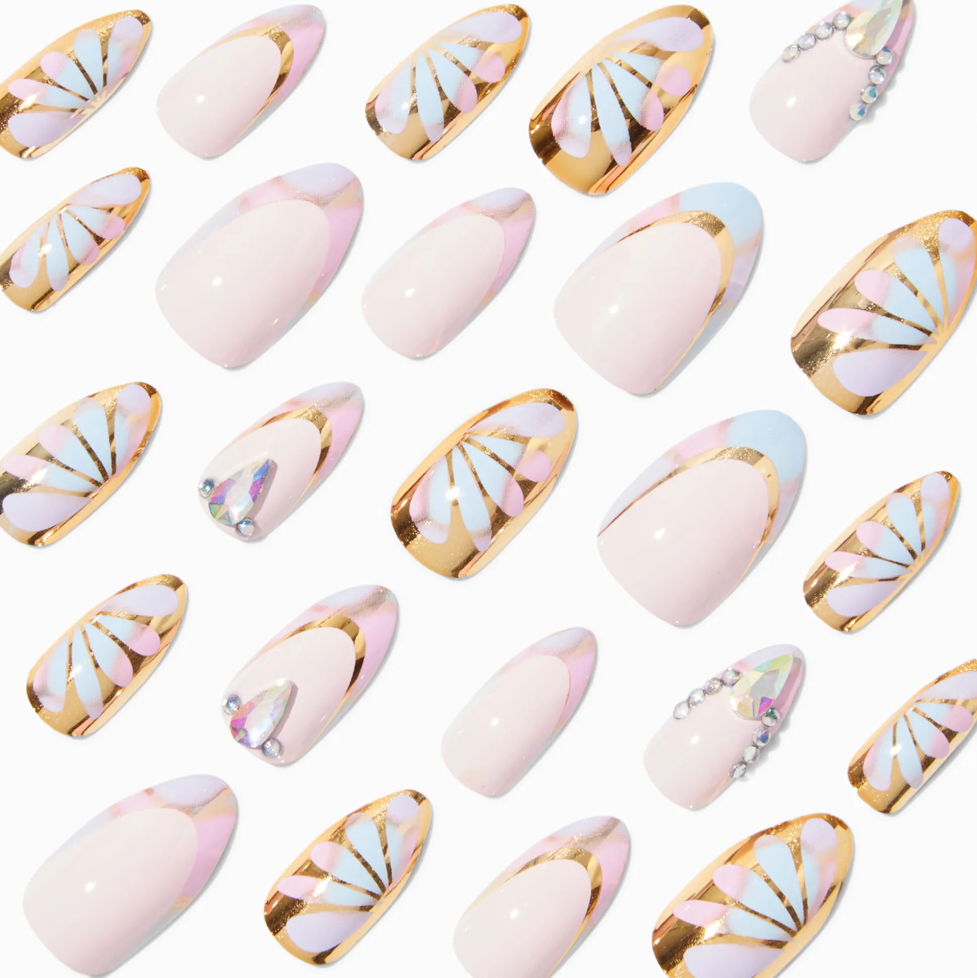 With an improved fit and up to a 7-day wear, these stiletto vegan faux nails are on-trend faves. They come in 12 different sizes, so finding the perfect shaped nail is a breeze. With a stiletto shape, these faux nails have a mixed daisy and gold chrome French tip finish.