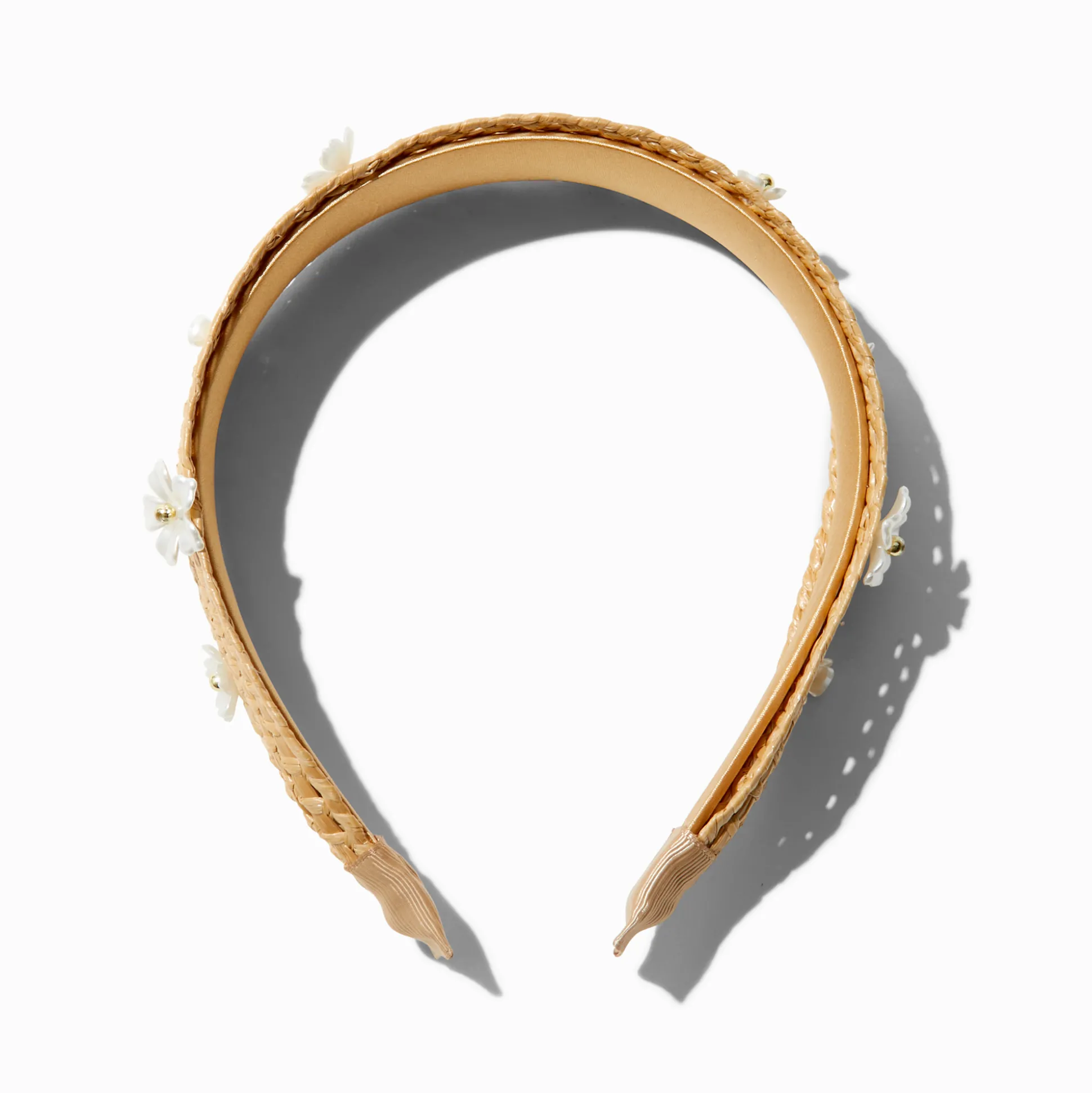 Pull back your hair & bangs with this summer-inspired headband. This raffia-style accessory has faux pearl and floral embellishments.