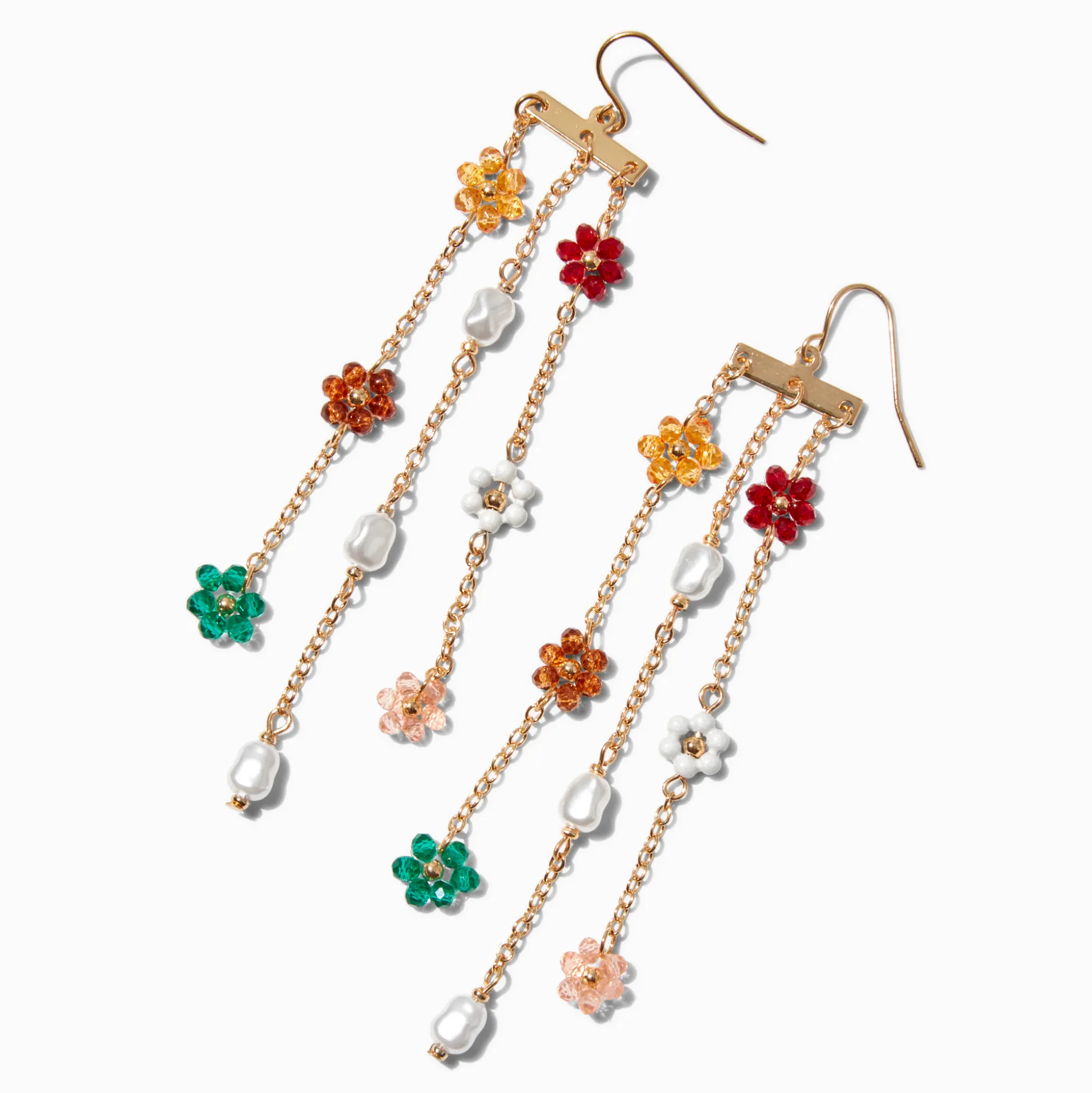 La frange est à la mode avec ces pendantes couleur dorée. Le crochet facile à manipuler comporte une frange multi-rangs doublée de perles d’imitation et de fleurs perlées.