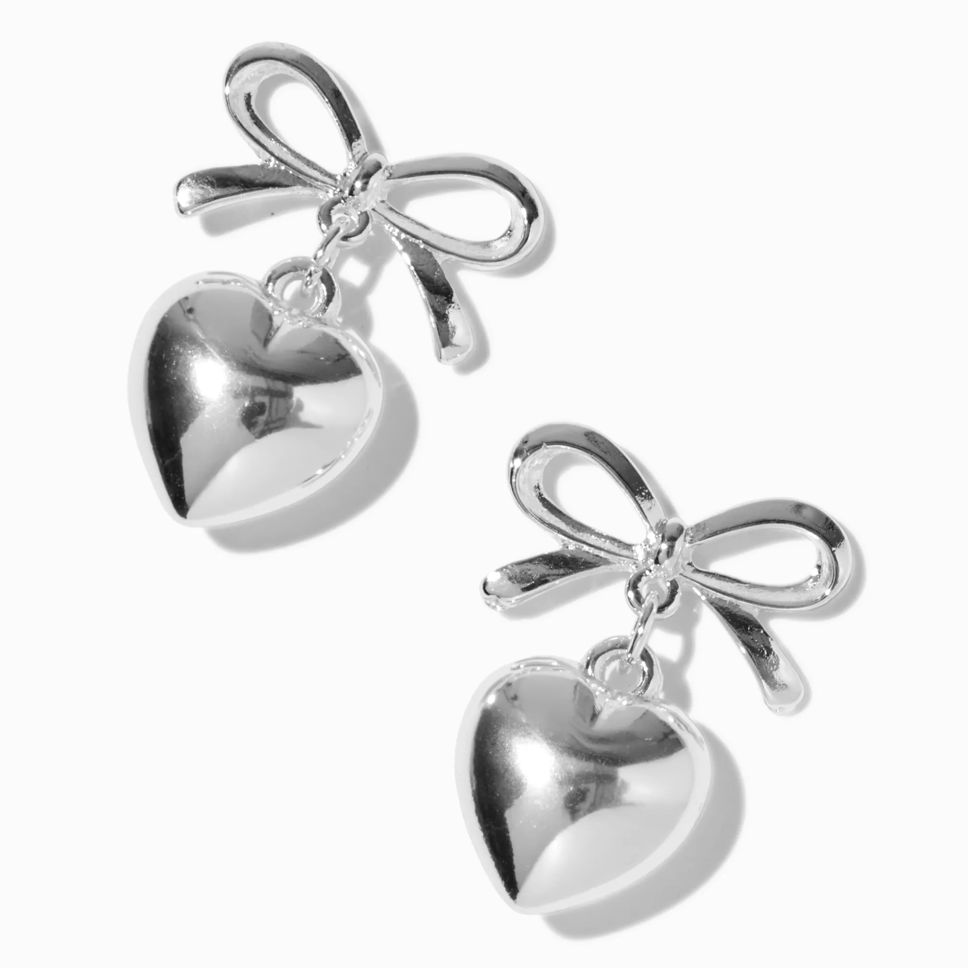 Ajoute du glamour et mets un nœud dessus avec ces pendantes faciles à mettre. Les boucles d’oreilles couleur argentée ont un design de nœud qui arbore un détail pendant en forme de cœur.