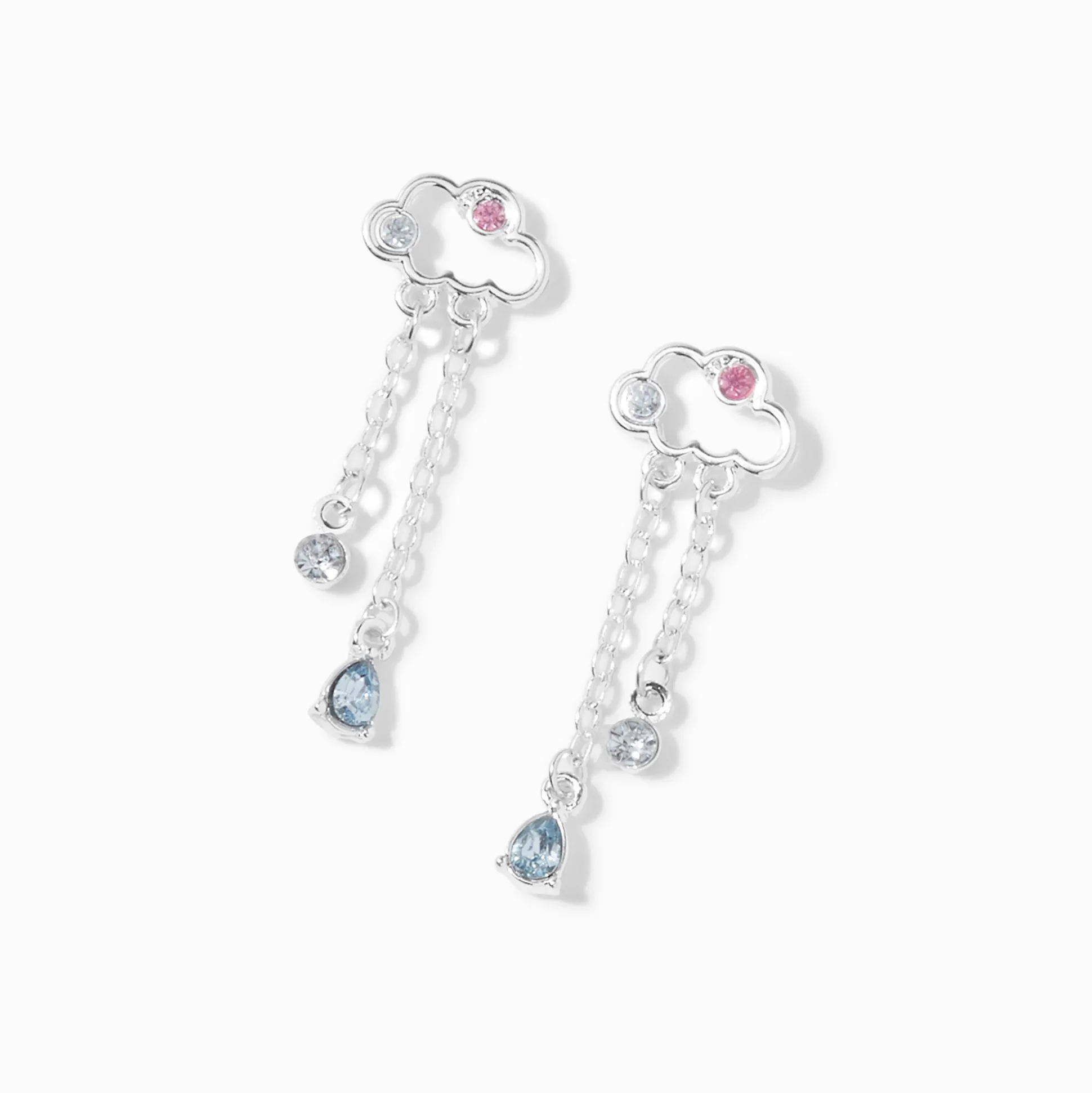 Sois heureuse quand il pleut avec ces pendantes couleur argentée. Les designs nuage arborent des gouttes de pluie qui sont décorées de strass.