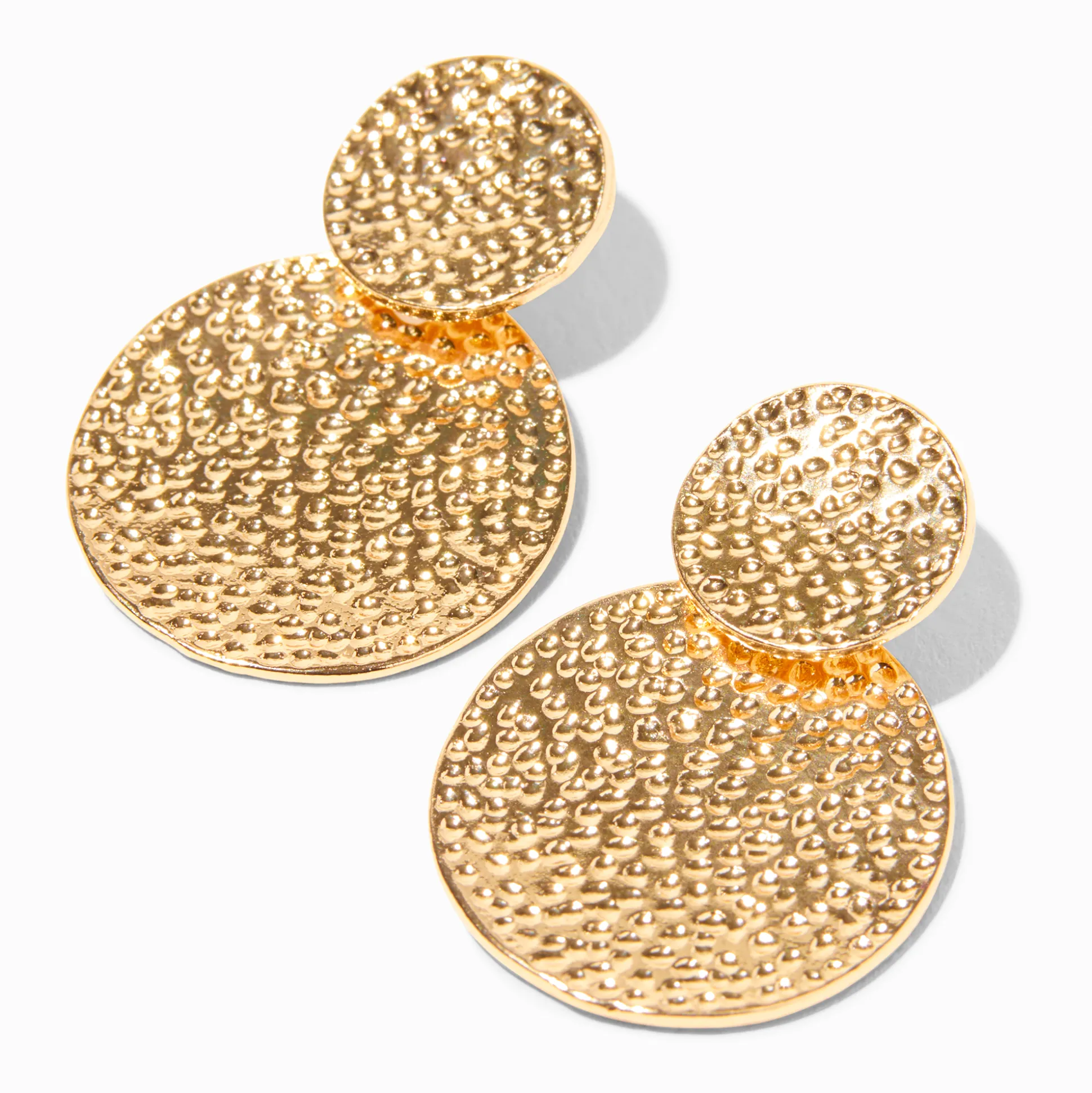 Décore tes oreilles avec ces disques texturés. Les pendantes couleur dorée arborent deux disques disposés en cascade avec un fermoir à tige arrière facile à utiliser.