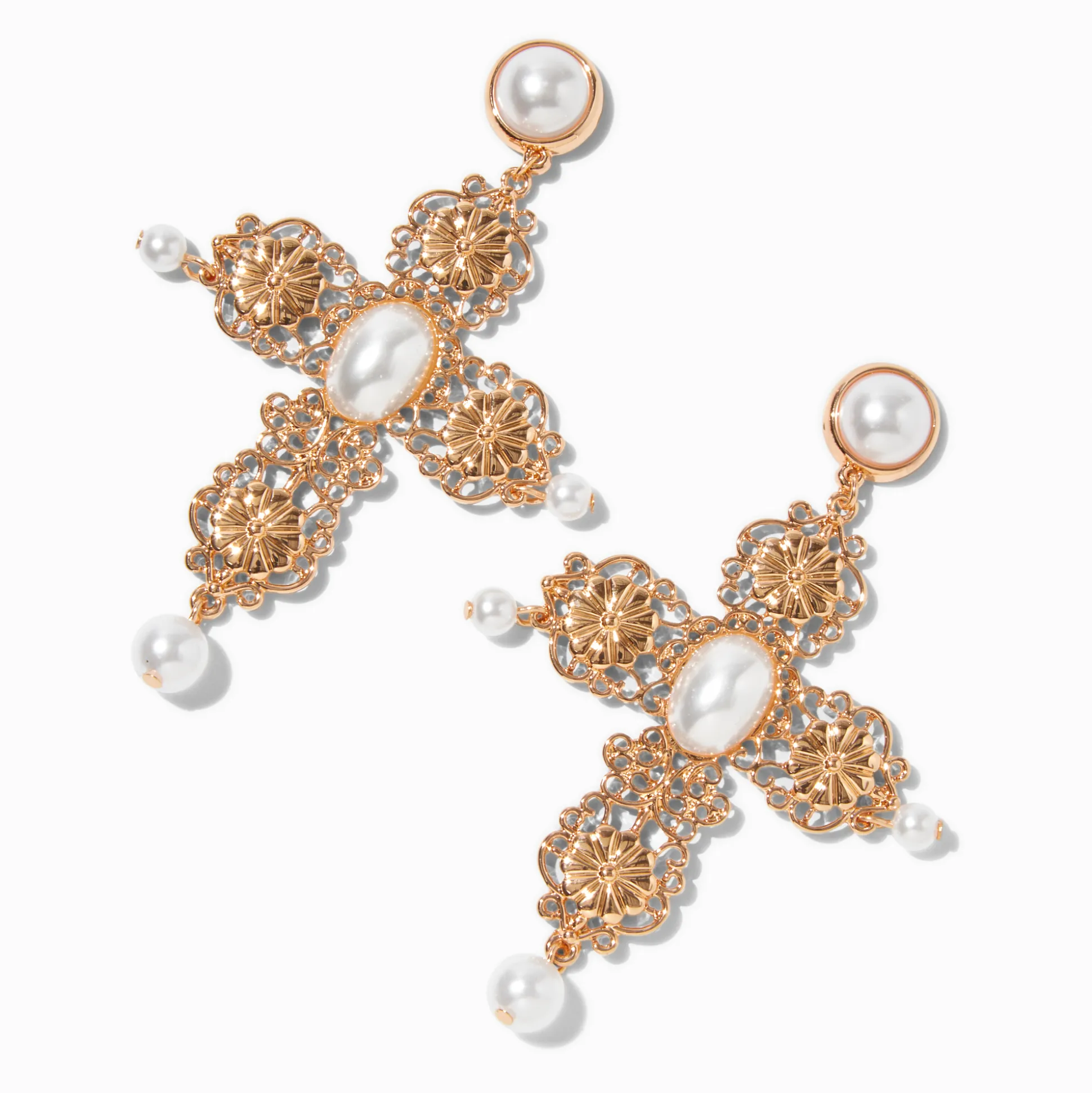Fais-toi remarquer avec ces pendantes couleur dorée. Les croix ornées arborent des accents en perle d’imitation.