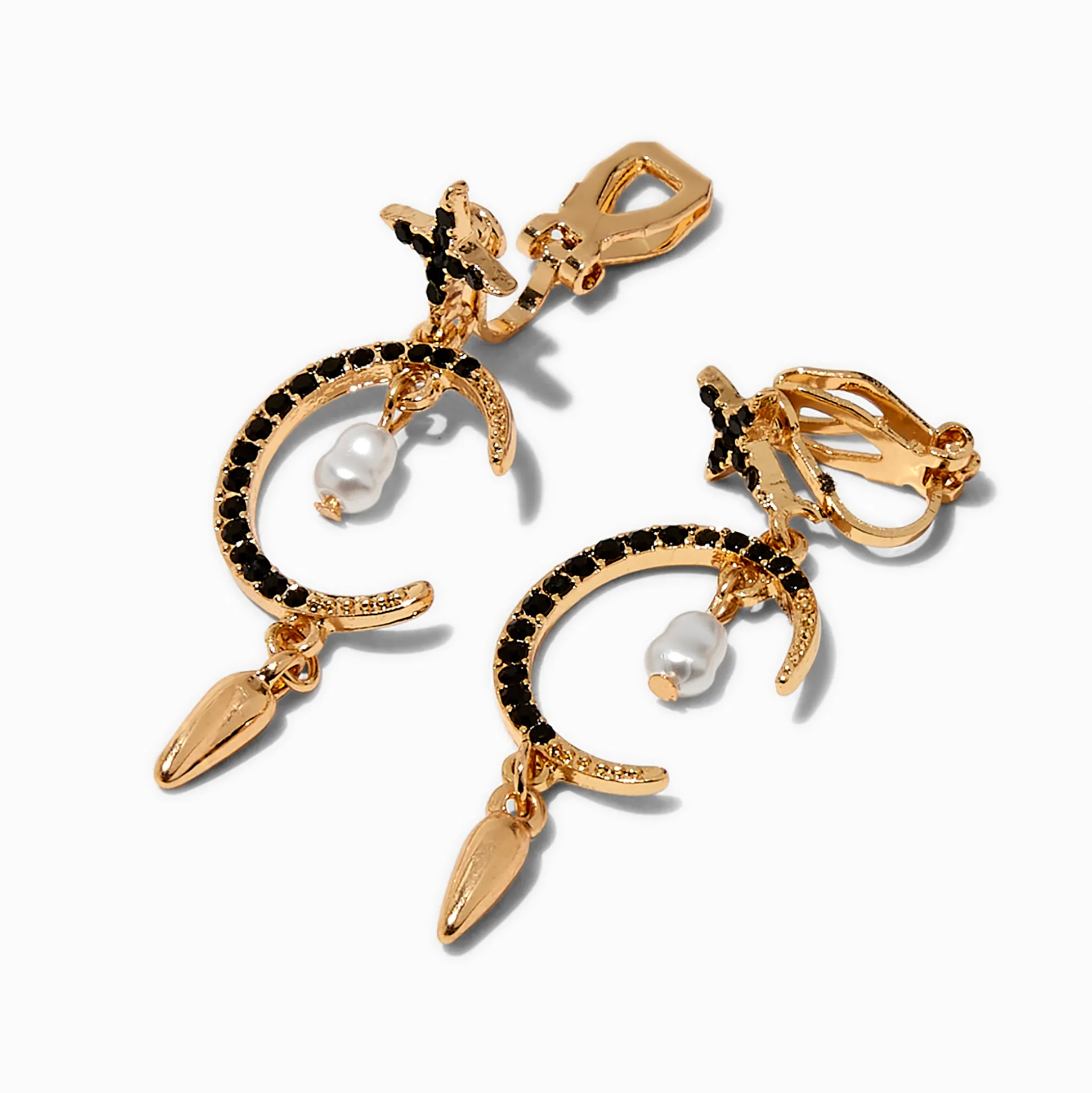 Récolte les likes quand tu portes ces boucles d’oreilles couleur dorée qui sont dotées d’un design croix et lune qui est décoré de strass noirs et de perles d’imitation. En plus, elles sont à clip, donc tu n’as pas besoin d’avoir les oreilles percées pour les porter.