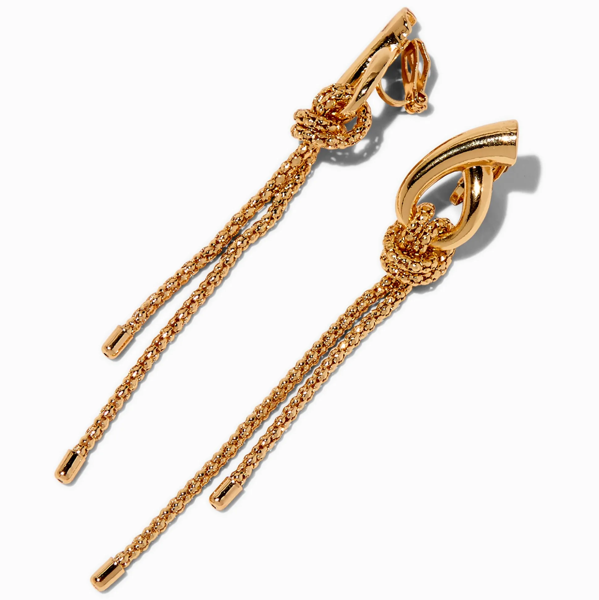 Nous apprécions tous le beau dénouement de ces boucles d’oreilles couleur dorée. Le nœud est agrémenté de chaînes pendantes. En plus, elles sont à clip, donc tu n’as pas besoin de piercing.