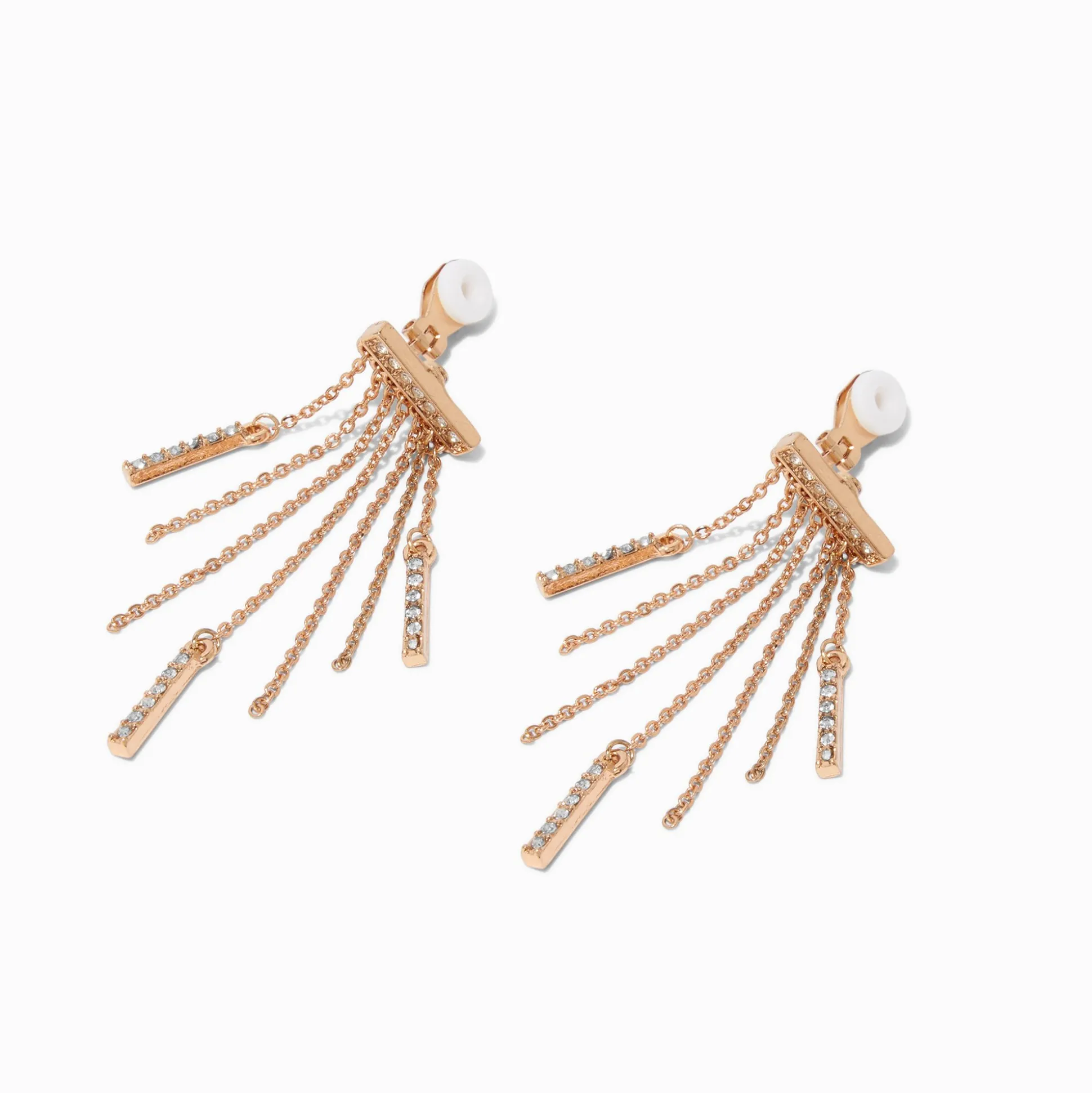 Pas besoin d’être percée pour être sublime lors de ta prochaine occasion spéciale. Ces boucles d’oreilles font le job. Ces boucles d’oreilles à clip couleur dorée sont constituées d’une barre recouverte de strass agrémentée de franges qui tombent en cascade. En plus, elles sont à clip, donc tu n’as pas besoin d’avoir les oreilles percées pour les porter !