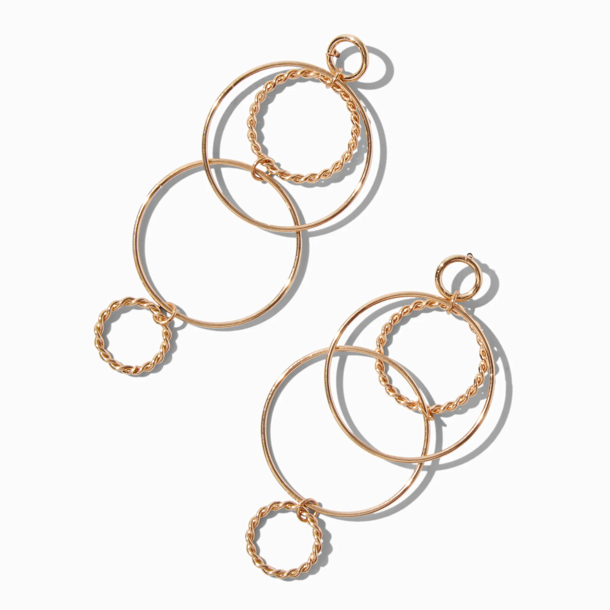 Sois toi et sois au top avec ces pendantes couleur dorée. Les designs à tiges de fixation arrière sont dotés d’un empilement d’anneaux entrelacés.