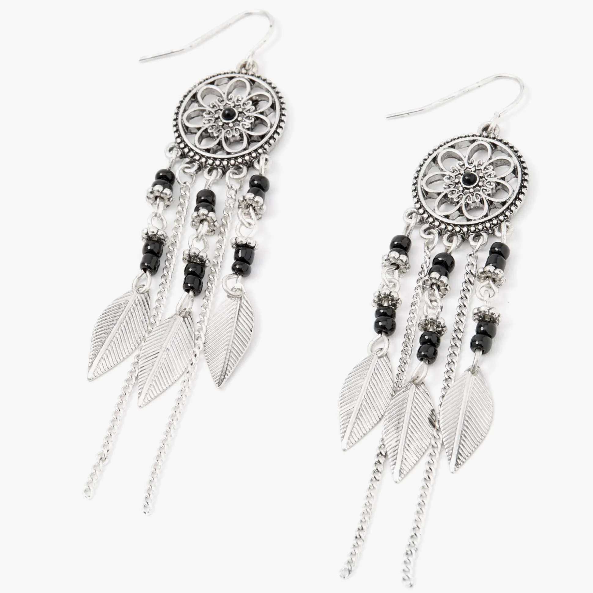 Adopte le style bohème avec cette paire de pendantes ! Cette paire de boucles d’oreilles est agrémentée d’un attrape-rêves au design floral avec des perles d’imitation noires, des chaînes linéaires, et des breloques plume.