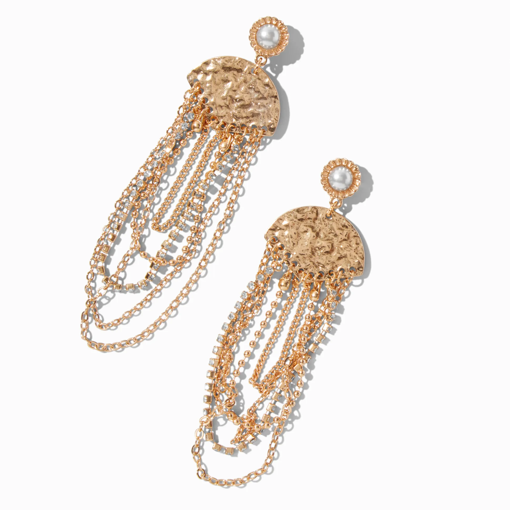 Sors du lot avec ces pendantes couleur dorée spectaculaires. Les boucles d’oreilles géométriques sont dotées de chaînes drapées texturées qui les rendent encore plus belles.