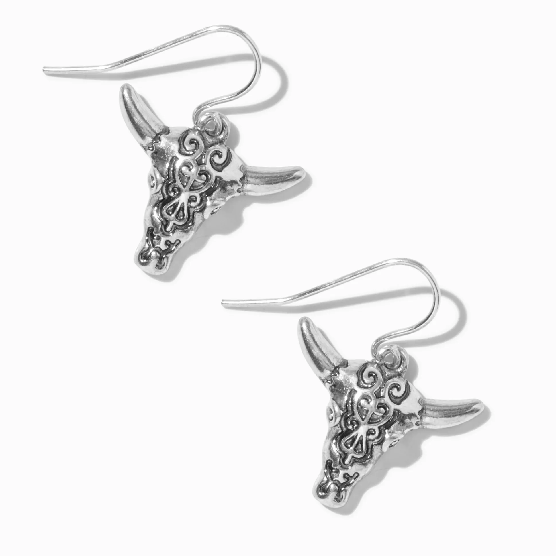 Yeehaw ! Ces pendantes arborent un crâne de vache longhorn en filigrane suspendu à une boucle style crochet.