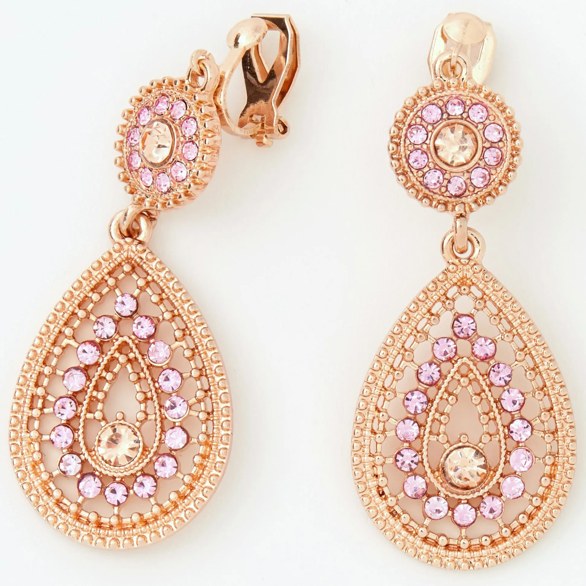 Obtiens un look glamour en portant cette paire de boucles d’oreilles à clip. Ces pendantes couleur doré rose sont rehaussées de strass roses pour une touche d’éclat girly.