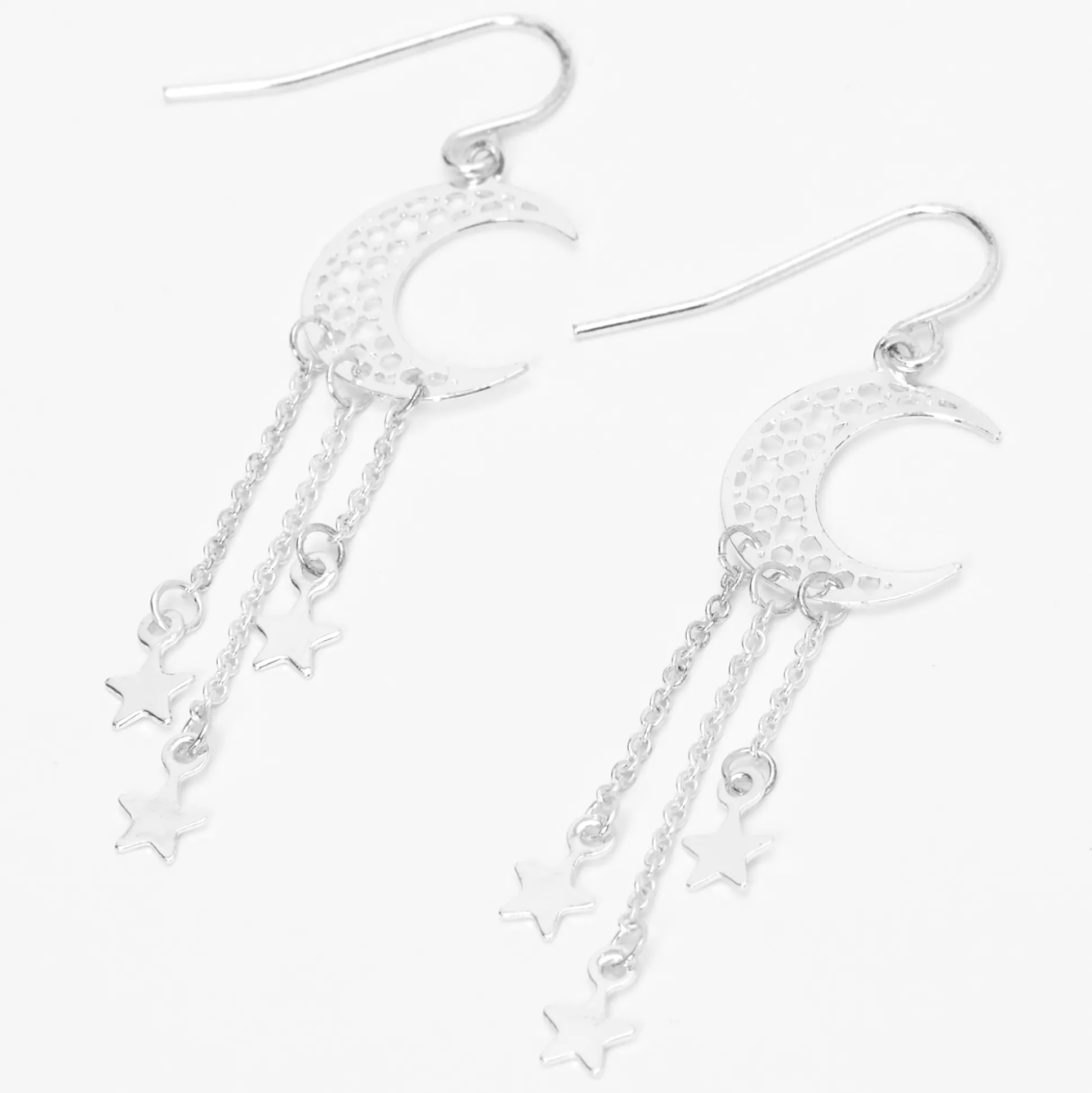 Rock some major celestial vibes with these drop earrings! This pair of earrings feature three star charms dangling from each crescent moon.