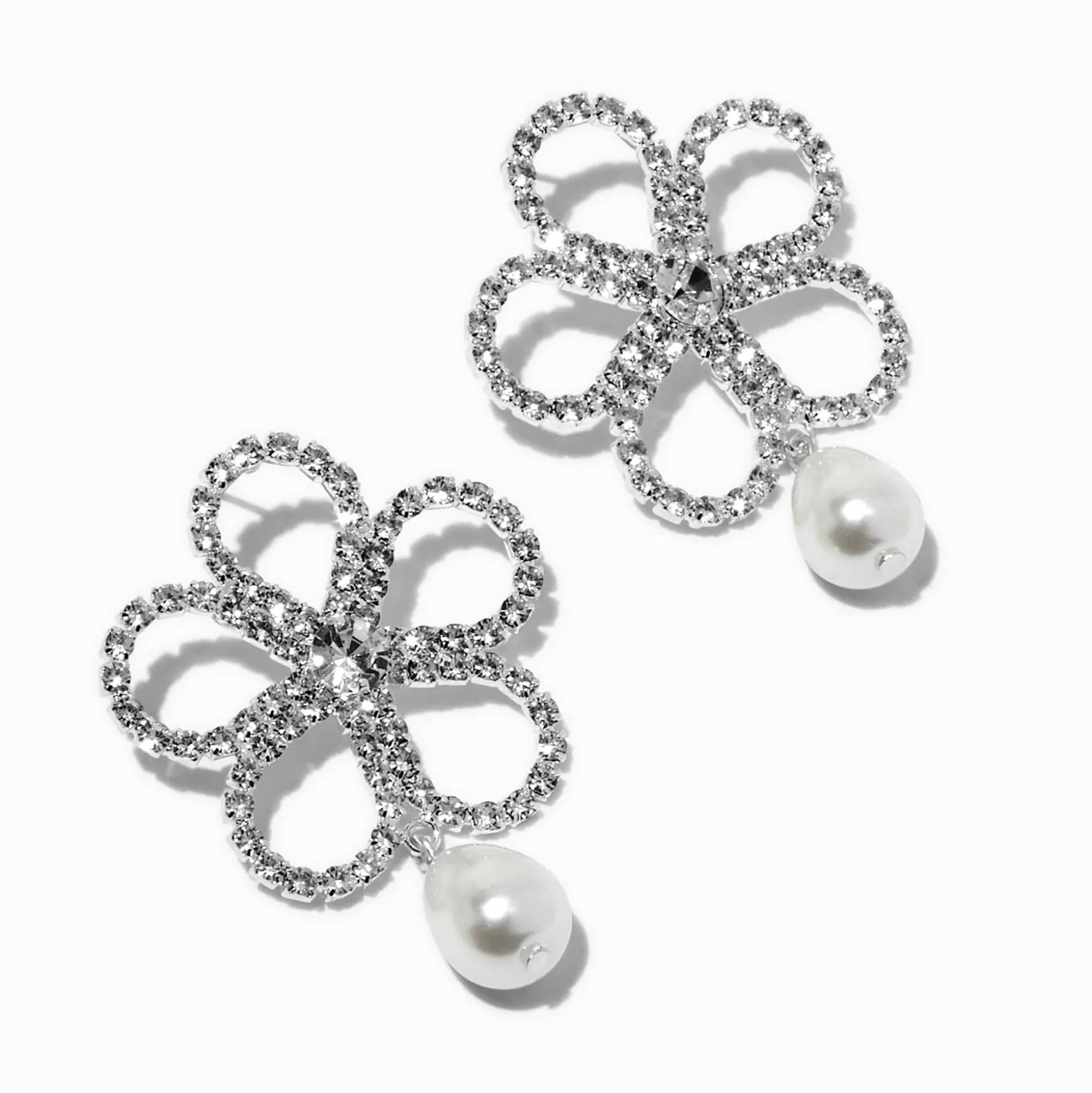 Apporte la touche finale à ton look avec la paire de pendantes parfaite. Les designs couleur argentée arborent des fleurs qui sont recouvertes de strass avec des ornements en perle d’imitation.